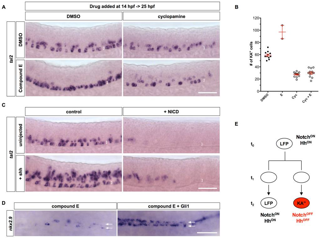 (A) Embryos treated with DMSO alone, compound E, cyclopamine, or both compound E and cyclopamine from 14 hpf to 25 hpf, were stained for the expression of tal2. (B) Quantification of total number of KA′′ cells in experiments shown in A. Note that the fewer data points in compound E treatment is due to the fact that most compound E-treated embryos had many tal2-positive cells in close clusters which prevents reliable scoring. The two data points thus underestimate the total number of KA′′ cells in E-treated embryos. Cyc: cyclopamine. (C) hsp-Gal4; UAS-NICD embryos and non-transgenic sibling controls were left uninjected or injected with Shh mRNA, heat-shocked at 11.5 hpf, and stained at 24 hpf for the expression of tal2. Brackets in A and C indicate the dorsal-ventral extent of the LFP domain. Scale bars: 50 μm. (D) hsp-Gli1 embryos and non-transgenic controls were injected with compound E at 15 hpf, and heat-shocked at 16 hpf, and stained at 22 hpf for the expression of nkx2.9. Arrows denote the two rows of LFP domains in dorsal views. (E) Model of KA′′ specification. At the early stage (t0), LFP progenitors have high level of Notch signaling activity and thereby maintain the progenitor state and Hh responsiveness (NotchON HhON). Active Hh signaling in progenitor cells is required for specifying the KA′′ identity in subsequent cell divisions. LFP progenitors can undergo three different types of divisions: symmetric LFP/LFP divisions, asymmetric KA′′/LFP divisions (shown here), and symmetric KA′′/KA′′ divisions. Divisions of LFP progenitors at t1 generate daughter cells with similar competence to either acquire the KA3 fate or maintain the LFP progenitor fate. Cell-cell interactions or stochastic fluctuations in Notch signaling result in cells with different levels of Notch signaling (t2). Cells that maintain high levels of Notch signaling will remain as LFP progenitors and continue to respond Shh (NotchON HhON). In contrast, cells that have attenuated Notch signaling will lose Hh response and differentiate into KA′′ interneurons (NotchOFF HhOFF). Since sustained Notch or Hh signaling disrupt the differentiation of KA′′ cells, formation of KA′′ cells initially depends on the activation and then the attenuation of Notch and Hh signaling.
