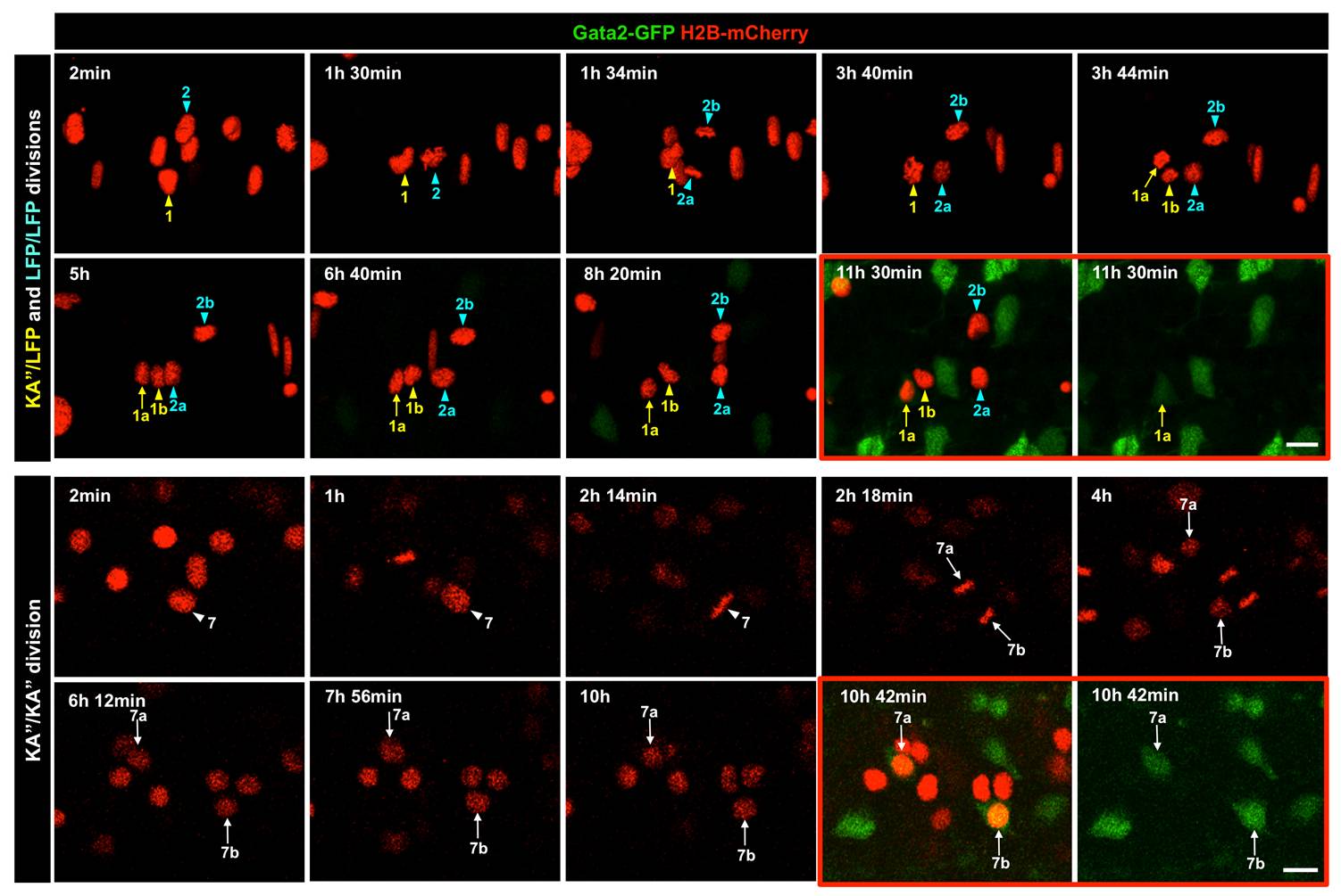 Fig. S1 Time-lapse imaging reveals different division patterns in the LFP domain. The top panel corresponds to the time-lapse sequence of the region containing cell 1, cell 2 and their daughter cells in Figure 2C and Video S1. Each frame is a projection of confocal slices containing cells of interest. The green channel was switched on after 6.5 hours. The bottom panel shows the time-lapse sequence of the region containing cell 7 in Figure 2C. Each frame corresponds to a single optical slice containing cells of interest. The green channel was switched on at the last time point. KA′′ cells and LFP cells are denoted by arrows and arrowheads, respectively. Cell 1, 2, and 7 undergo KA′′/LFP, LFP/LFP, and KA′′/KA′′ divisions, respectively. The time point of each frame is indicated on top. For the final time point, both the merged image and the image with the green channel alone are shown (red boxes). Scale bars: 10 μm.