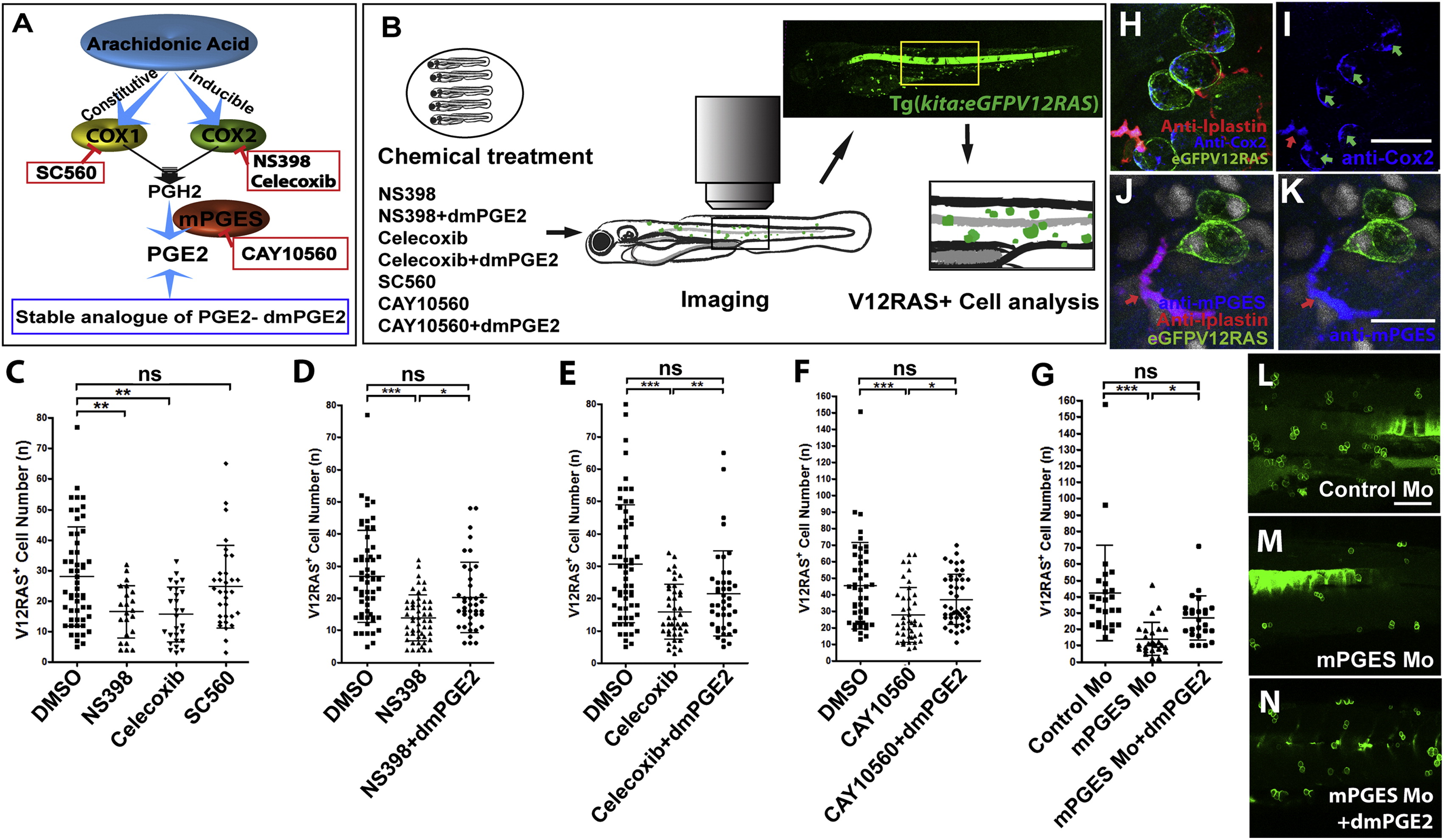 Fig. 1 Blocking COX-2-mPGES-Mediated PGE2 Production Suppresses the Growth of V12RAS+ Transformed Cells In Vivo(A) A schematic representation of PGE2 production through the COX-2 pathway indicates the targets and inhibitors used in this study.(B) A schematic representation of our pharmacological treatment regime and clonal analysis of transformed cells (green) in V12RAS+-cell-bearing larvae. A yellow box indicates the flank skin region in which we quantified alterations in growth of V12RAS+ cells.(C–G) Graphic comparisons of V12RAS+ cell numbers in larval flank skin region after various treatments; (C) larvae treated with DMSO, COX-1 inhibitor, SC-560, and the COX-2 inhibitors NS398 and Celecoxib (p < 0.01, n = 22, 27, and 32, respectively); (D) larvae treated with DMSO, NS398, and NS398 +dmPGE2 (p < 0.001, n = 56, 51, and 40, respectively); (E) larvae treated with DMSO, Celecoxib, and Celecoxib +dmPGE2 (p < 0.001, n = 61, 42, and 42, respectively); (F) larvae treated with DMSO, CAY10560 and CAY10560 +dmPGE2 (p < 0.001, n = 45, 42, and 46, respectively); (G) Control morphants, mPGES morphants, and mPGES morphants rescued with dmPGE2 (p < 0.001, n = 26, 25, and 25, respectively).(H) Immunostaining for COX-2 (blue) indicates that both leukocytes (anti-L-plastin [red]) and V12RASeGFP+ transformed cells (green) express COX-2.(I) Single-channel image of (H), better showing COX-2 expression; green and red arrows indicate transformed cells and leukocytes, respectively.(J) Immunostaining for mPGES (blue) indicates its expression by some leukocytes (anti-L-plastin; red arrow) but not transformed cells (green).(K) Single-channel image of (J).(L–N) Representative images of flank skin regions showing V12RAS+ clones (green) of (L) control morphant, (M) mPGES morphant, and (N) mPGES morphant supplemented with dmPGE2- Scale bars represent 20 μm (H and I), 15 μm (J and K), and 100 μm (L–N). See also Figures S1, S2, and S3.