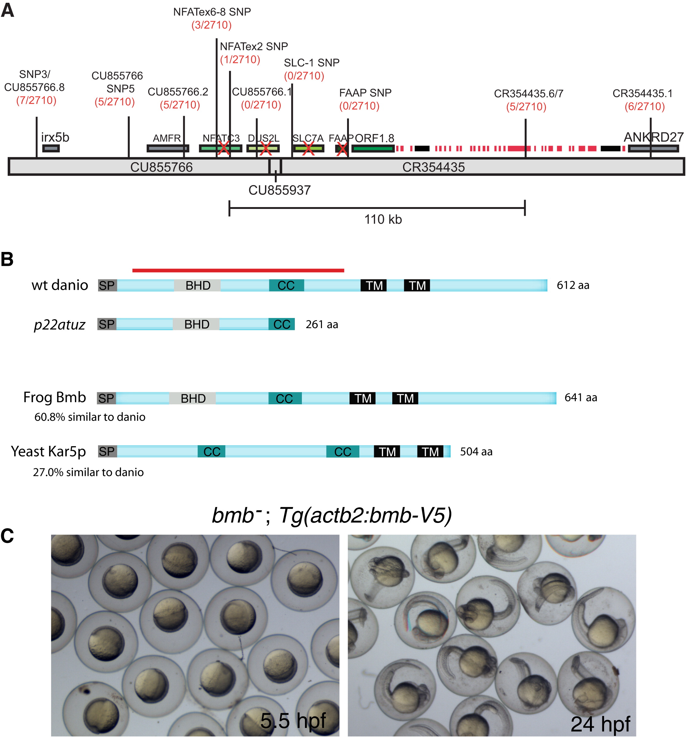 bmb Encodes a Conserved Predicted Transmembrane Protein(A) Recombinants over total meiotic events are indicated parenthetically in red below the marker name. Candidate genes eliminated based on their WT cDNA sequence are indicated with a red X. A histone gene cluster is indicated as red boxes. Two predicted transposable elements are indicated by black boxes.(B) ORF1.8 encodes a 612 residue protein with a predicted N-terminal signal peptide sequence (SP) followed by a BHD, a coiled-coil (CC), and two C-terminal transmembrane domains (TM) initiating at amino acid residues 363 and 415 (TMpred program) (Hofmann and Stoffel, 1993). Yeast Kar5p is 27% similar (excluding the C-terminal region) to the D. rerio homolog. The red bar corresponds to the recombinant protein used to generate Bmb antibodies.(C) Rescued bmb embryos at 50% epiboly (5.5 hpf) and 24 hpf.See also Figure S1.