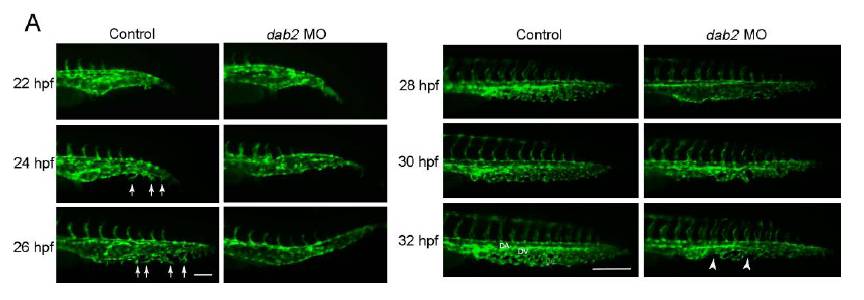 (A) CVP development in dab2 MO injected embryos. In dab2 MO injected embryos, ventral sprouts from the caudal vein failed to emerge at 22hpf. Until 28hpf, the developing CVP in dab2 MO injected embryos are largely devoid of ventral sprouts. This initial defect in the formation of ventral sprouts caused dysmorphic CVP at 32hpf in dab2 MO injected embryos. Arrows present ventral sprouting of endothelial cells and arrowheads point to gaps within the CVP. Abbreviations: DA: Dorsal Aorta, DV: Dorsal Vein, VV: Ventral Vein. Scale bars are 100μm for 26hpf and 200μm for 32hpf.