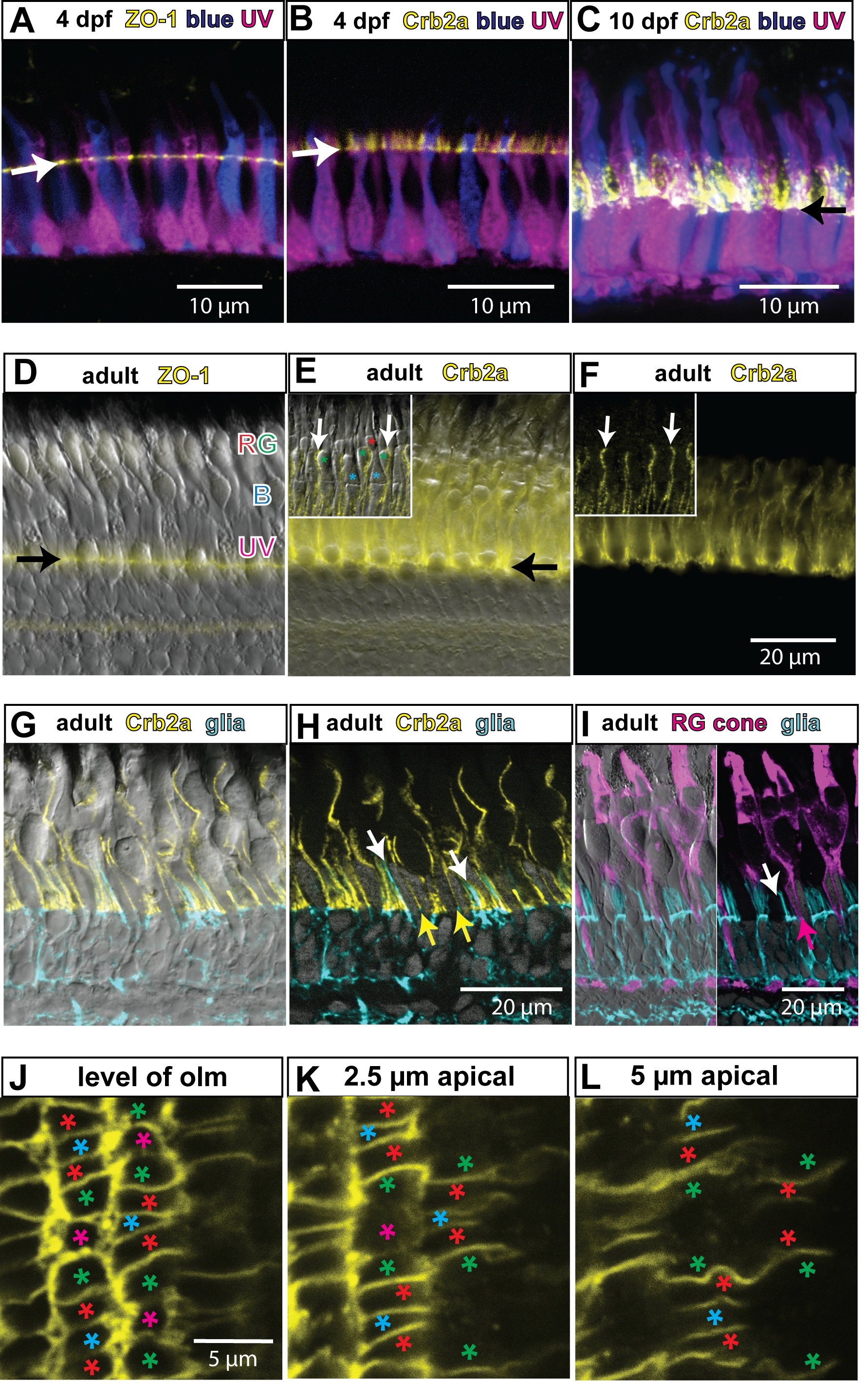 Differentiation of cone photoreceptors and elaboration of the apical process. A) Retinal cryosection from larval transgenic (mi2009) fish at 4 days post-fertilization (dpf), in which blue and UV cones express the reporters mCherry and EGFP (pseudocolored blue and magenta, respectively), which fill the cytoplasm of the cells. The OLM (arrow) is labeled by ZO-1 immunostaining (yellow). The developing inner and outer segments of the cones project apically beyond the OLM. B) Larval mi2009 fish at 4 dpf immunolabeled for Crb2a (yellow). Note that the Crb2a protein extends beyond the OLM (arrow) on the plasma membrane of the inner segments. C) By 10 dpf, the cone inner and outer segments have elongated further and the Crb2a protein also extends further apically on the inner segments. The arrow indicates the level of the OLM. D) Differential interference contrast (DIC) image of a retinal cryosection from an adult zebrafish, immunolabeled with ZO-1 (yellow) to label the OLM (arrow). The inner and outer segments of cones extend apically; the UV cones are the shortest, the blue (B) cones are longer, and the red and green (RG) double cones are the longest. E) A DIC image with immunolocalization of Crb2a protein on the inner segments of the cones. The black arrow indicates the OLM. The inset shows the Crb2a protein at the interface between red and green double cones (white arrows). F) Same image as panel E without the DIC channel. G) Differential interference contrast (DIC) image of a retinal cryosection from an adult transgenic zebrafish (mi2002), expressing a fluorescent reporter in Müller glia (cyan), and immunolabeled with Crb2a (yellow). H) Same image as panel E without the DIC channel. The processes of Müller glia (white arrows) extend apically beyond the OLM, but not as far as the Crb2a (yellow). Müller processes do not separate the interface between the inner segments of red and green double cone pairs, which have strong staining for Crb2a (yellow arrows). I) Left half: DIC image of a retinal cryosection from an adult transgenic zebrafish (mi2002), expressing a fluorescent reporter in Müller glia (cyan), and immunostained with zpr1, which labels red and green cones (magenta). Right half: same image without the DIC channel. The processes of the Müller glia (white arrow) are not interposed between the inner segments of red and green double cone pairs (magenta arrow). J–L) Individual optical sections from a z-stack confocal image of Crb2a immunolabeling near the retinal margin in a retinal flat-mount (cropped version from the same image series shown in Figure 6A). Panel J is at the level of the OLM, panel K is the subapical region (SAR) at 2.5 μm from the OLM, and panel L is the SAR at 5 µm from the OLM. Identity of cone photoreceptor subtypes is indicated by asterisks: red, green, blue, and UV (magenta), respectively. In the SAR, Crb2a has a planar polarized distribution – it is expressed at higher levels at the interfaces of red, green, and blue cones within a column. The retinal surface is curved, so the left and right sides of each panel are more apical than the center (and thus show a somewhat more polarized Crb2a distribution in J and K).