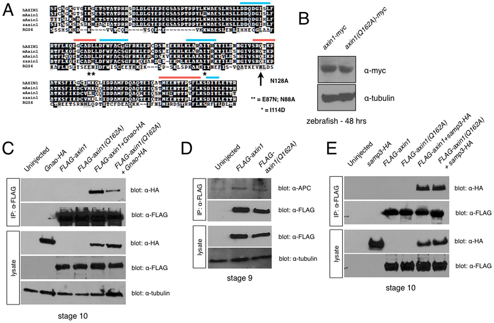 (A) Alignment of RGS domains from human (hAXIN1), mouse (mAxin1), Xenopus (xAxin1) and zebrafish Axin1 (zAxin1) with human RGS4. Blue bars = APC binding interface; orange bars = Gna binding interface. * = residues required for GAP activity in RGS4. Arrow = residue required for RGS4 GAP activity, mutated in this study. (B) Immunoblots showing equivalent protein expression in 24 hpf zebrafish embryos injected with axin1-myc and axin1(Q162A)-myc. (C) Immunoprecipitation of FLAG-tagged Axin1 constructs with HA-tagged Gnao, showing reduced binding of FLAG-Axin1(Q162A) to overexpressed Gnao. (D) FLAG-Axin1 and FLAG-Axin1(Q162A) immunoprecipitate endogenous APC equivalently. (E) FLAG-Axin1 and FLAG-Axin1(Q162A) immunoprecipitate HA-tagged APC-SAMP3 equivalently.