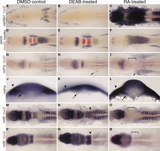 Fig. 5 nr2f expression at 12 hours post fertilization (hpf) with retinoic acid (RA) and DEAB treatment 8–10 hpf. A–C: Expression of RA target gene cyp26a1 to confirm treatment efficiency, co-stained with myoD (red) to mark the myotome. D–F: MHB and hindbrain markers pax2a, krox20 (red), and hoxd4a show changes in tissue specification. G–I: nr2f1a expression. Arrow indicates changes in lateral plate mesoderm (LPM) expression. J–L: Transverse sections showing changes in nr2f1a transcript levels in the endoderm (arrows) and LPM (arrowheads) at anteroposterior levels designated by dashed lines in G–I. M–O: nr2f2 expression. P–R: nr2f5 expression. N,Q: Arrowheads indicate a posterior extension of hindbrain expression. Brackets indicate loss of hindbrain expression.