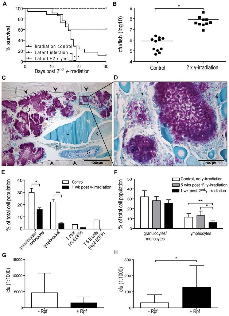 (A–C) Zebrafish (n = 17) with a latent M. marinum infection were irradiated twice with 25 Gy with one month between the irradiations. Twice irradiated, non-infected zebrafish (n = 23) as well as zebrafish with a latent infection (n = 14) were included as controls. (A) Survival was followed for 30 days after the second dose. *P<0.05. (B) During this period, moribund or recently dead fish were collected 15–22 days after the second radiation dose. Bacterial loads were compared with those of similarly infected, non-irradiated control fish that were collected at the end-point of the experiment. *P<0.05 (C&D) A representative Ziehl-Neelsen stained sample from a reactivated fish showing large numbers of free mycobacteria (purple areas) in the zebrafish body cavity (C). The sides of the body cavity are marked with arrowheads O = ovary, P = pancreas, L = liver, G = gut, K = kidney. (D) A picture taken with a higher magnification showing individual rods (few examples pointed out with arrows). (E) Four groups of 4 adult zebrafish (1 rag2-gfp, 1 lck-gfp and 2 wild-type groups) were γ-irradiated with 25 Gy. Similar control groups were left untreated. Kidneys were collected 8 d post irradiation, pooled and analyzed by FCM. FSC-SSC -plots were gated based on cell size and granularity as described in [56] (gates shown in Figure S3) to assess the effect of irradiation on leukocyte populations. *P<0.05. For further verification of the effect of radiation on lymphocytes, a GFP gate was used for the rag2 and lck groups expressing GFP in B and T cells, or T cells, respectively. (F) Adult non-infected wt zebrafish were irradiated with 25 Gy once (grey bars) (n = 3) or twice (n = 7) (black bars) with one month between the doses. Leukocyte recovery and re-depletion were assessed by FCM. Non-irradiated fish (n = 4) were used as controls. *P<0.05 (G) Fish with a latent infection (n = 7) were irradiated twice with 25 Gy with one month between the doses and plated +/- Rpf for 18 d after the second radiation dose. (H) Fish (n = 6) with a latent infection were plated +/- Rpf.