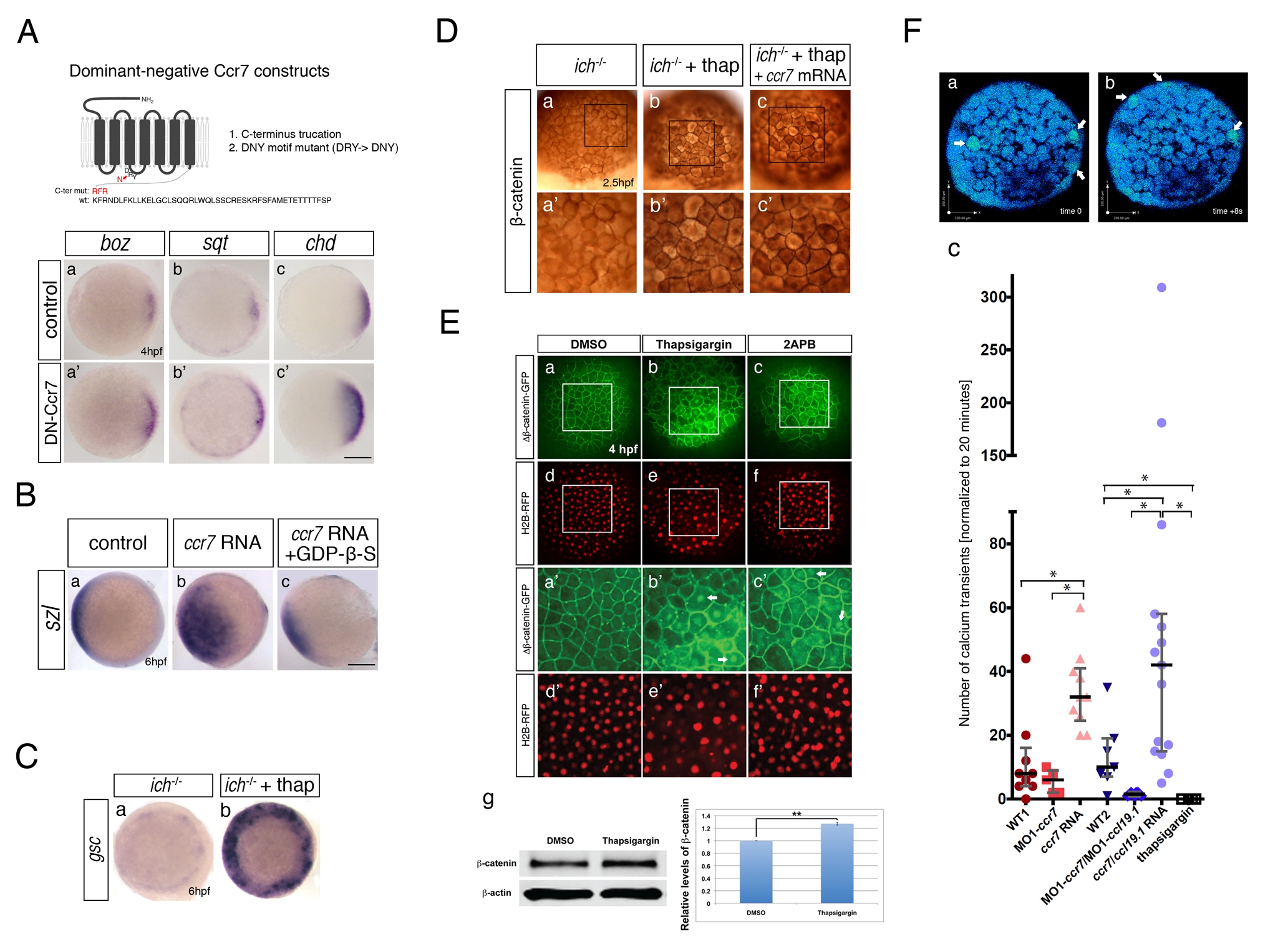 (A) Misexpression of two dominant-negative Ccr7 mutant forms promotes organizer gene expression. Top panel, a schema of the mutant forms employed: DN1, C-terminal truncation, and DN2, DRY→DNY mutant. Bottom panel shows effects of injecting 100 pg DN2-ccr7 RNA on boz (a2, n = 14/18) and sqt (b2, n = 11/15), and of DN1-ccr7 RNA on chd (c2, n = 13/20) expression compared to uninjected control embryos (a–c) at sphere stage, 4 hpf. Animal views, dorsal to the right. (B) Expression of szl in control embryos (a, n = 8/8) was expanded in ccr7 RNA injected WT embryos (b, 150 pg, n = 14/14), and suppressed by co-injection of GDP-β-S (~300 nM) at shield stage (c, n = 12/15, two experiments). Animal views, dorsal to the right. (C) gsc expression in control (a) and thapsigargin-treated ich mutants (b; 4 µM; n = 20/20) at shield stage, 6 hpf. Animal views, dorsal to the right. (D) β-catenin immunostaining in control (a, a2), thapsigargin-treated ich mutants (b, b2 4 µM; n = 6/6), and thapsigargin-treated ich mutants injected with ccr7 RNA (c, c2 n = 5/6). (a2–c2) Higher magnification images of the boxed areas in a–c. (E) Thapsigargin (b, b2) and 2-APB-treated WT embryos (c, c2) showed increased level and nuclear ΔNβ-catenin-GFP signal, compared to control embryos (a, a2). H2B-RFP RNA was injected as nuclear background control (d, d3, e, e2, c, c2). (d) Western blot for total β-catenin and actin in control (DMSO-treated) and thapsigargin-treated (4 μM) WT embryos at 4 hpf, with relative quantification to β-actin from three independent experiments in the right panel. (F) Effects of ccr7 and thapsigargin on Ca2+ transients in superficial blastomeres. (a, b) Examples of Ca2+ transients revealed by in vivo ratiometric image analysis in a WT embryo at 512-cell stage. The arrows point out the Ca2+ transients at consecutive time points (still images). Note the rapid changes of Ca2+intensity (compare b to a, 8 s interval). (c) The number of Ca2+ transients normalized to 20 min in control embryos (WT1, n = 9, red; WT2, n = 7, blue), ccr7 morphants (n = 5), Ccr7 overexpressing blastulae (n = 10), ccr7/ccl19.1 double morphants (20 ng/2 ng; n = 8), and Ccr7/Ccl19.1 overexpressing (200 pg/200 pg RNA; n = 15), and thapsigargin-treated (n = 4) blastulae were quantified by in vivo time-lapse imaging with Calcium Green-1 at about 256-cell stage or 2.5 hpf (see Materials and Methods for detail). Red and blue data were collected over 10 and 20 min, respectively; * p<0.05, Student′s t test, unequal variance.