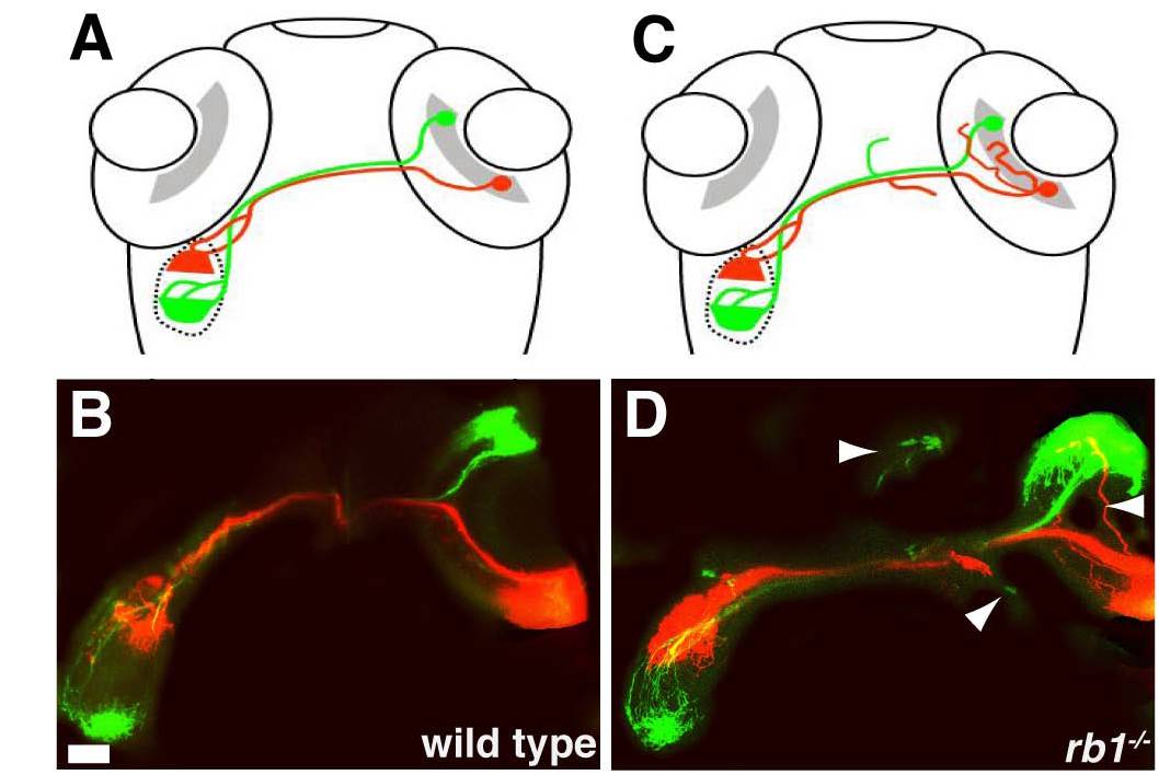 Fig. S3 Retinotopic mapping is intact in rb1te226a tectum. Dorsal views of schematized (A, C) and confocal projections (B, D) of retinotectal projection in wild type (A, B) and rb1te226a larvae at 120 hpf. DiO (green) labeled axons from anterior RGCs innervate the caudal tectum, while DiI (red) labeled axons of posterior RGCs project to the rostral tectum in both wild type and rb1te226a larvae. Arrowheads mark misprojecting axons. Scale bar = 50 μm.