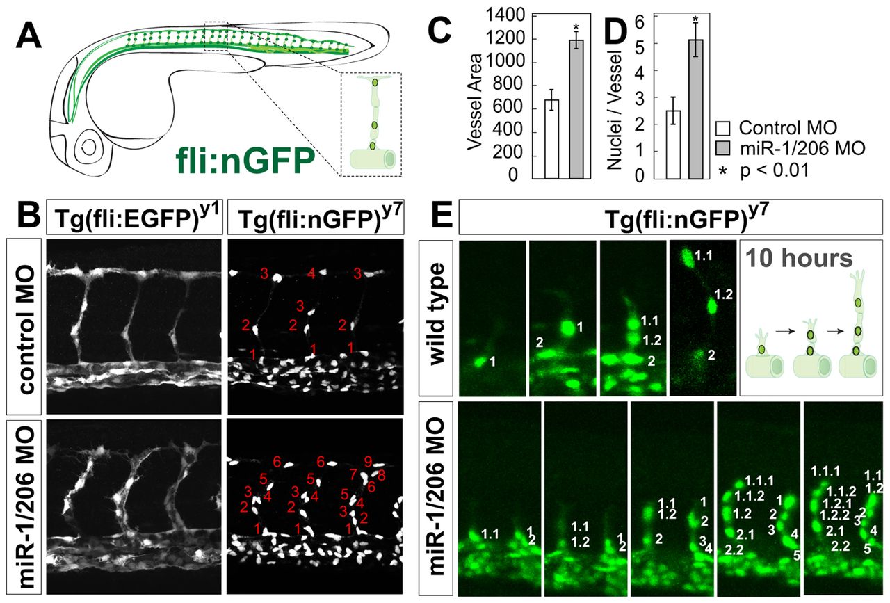 Fig. 1 miR-1 and miR-206 regulate developmental angiogenesis. (A) Schematic representation of the zebrafish vasculature. The intersegmental vessels (ISVs) form by sprouting endothelial cells from the dorsal aorta and are typically composed by three cells: the tip, the stalk, and the basal cell that connects to the aorta (inset). (B) ISVs labeled with cytoplasmic GFP [Tg(fli-EGFP)y1] or nuclear GFP [Tg(fli-nGFP)y7] after injection of control morpholino (MO) or miR-1/206 MO at the one-cell stage. (C,D) Quantification of the cross-sectional area (C) and average number of nuclei per ISV (D) in control MO-injected and miR-1/206 MO-injected embryos at 30 hpf. Note the increase in ISV size (cross-sectional area) and number of endothelial cells in embryos injected with miR-1/206 MO compared with control MO-injected embryos. Mean ± s.d.; Student′s t-test. (E) Individual frames of a time-lapse confocal analysis of the vascular phenotype in wild-type and miR-1/206 MO-injected embryos between 18 and 28 hpf. Endothelial cells migrating into the vessel are numbered (1, 2, 3, etc.) and their daughter cells are labeled (1.1, 1.2, 1.2.1, etc.). The wild-type ISV shows a highly stereotyped pattern, in which a single endothelial cell migrates to the trunk midline and divides, leaving one cell stationary while the tip cell continues to migrate dorsally. Endothelial cells in miR-1/206 MO-injected embryos show elevated proliferation within the ISV (left vessel), as well as an increase in migration from the aorta (right vessel).