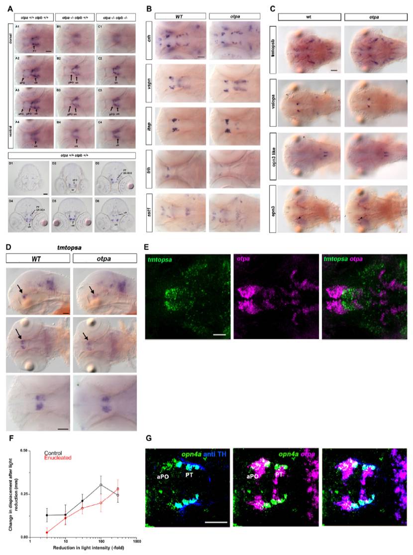 (C) Expression of “nonvisual” opsins in wild-type and otpa mutants. Expression of tmtopsb, valopa, opn3-like, opn3 at 3dpf in wild-type embryos and otpam866 mutants. Whole-mount in situ hybridization (3 dpf) reveals that otpa mutants do not show reduced expression of the analyzed nonvisual opsins. Dorsal view. Scale bar is 50 μm.