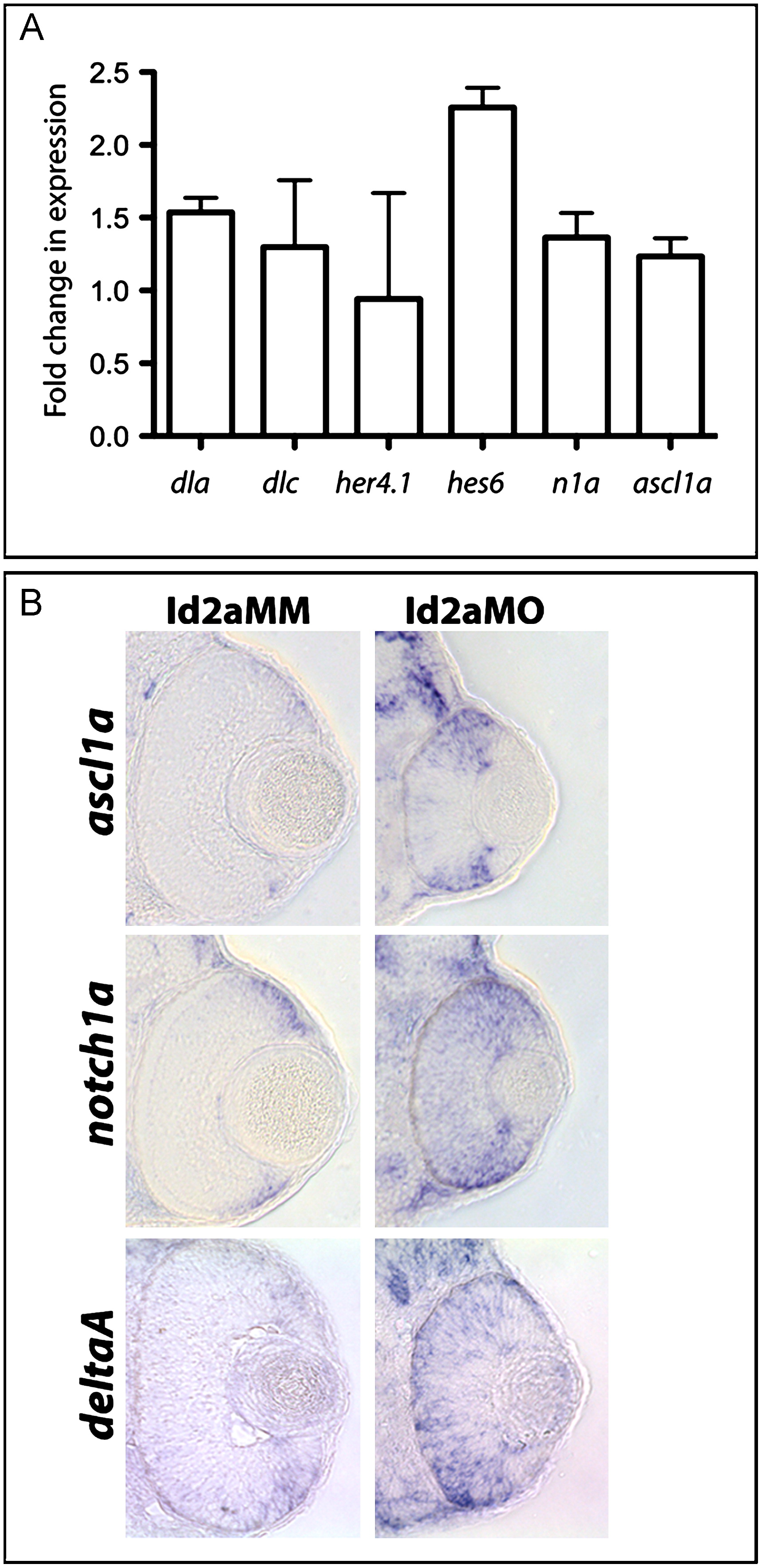 Fig. 3 Notch pathway component gene expression is upregulated in Id2a-deficient retinae. (A) qRT-PCR quantification of 48 hpf dla, dlc, her4.1, hes6, n1a and ascl1a levels in Id2aMO and Id2aMM retinae. Transcript levels were normalized to tubulin, alpha 1 and the fold-change in expression in Id2aMO vs. Id2aMM presented. Error bars represent SEM, **p<0.05, n=3 biological replicates. (B) Transverse sections reveal the expression domains for ascl1a, notch1a and deltaA in Id2aMM and Id2aMO embryos at 48 hpf following in situ hybridization (n=6 sectioned embryos/condition).