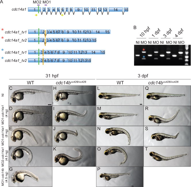 Fig. 2 Characterization of cdc14a1 morphological phenotype. A: Structure of cdc14a1 gene and aberrant transcripts. Green bars indicate translation start codons and orange bars indicate in frame stop codons. The sequence targeted by each cdc14a1 MO is indicated in purple. Yellow arrows indicate the sequence of the primers used for RT-PCR in B. B: Efficiency of 8 ng MO1-cdc14a1 over time by RT-PCR. C–T: Comparison of morphological phenotypes between non-injected and MO1-cdc14a1 injected embryos. C,L: Non-injected (NI) wild-type (WT) embryos; H,Q: non-injected cdc14bvu426/426 homozygous mutant embryos; D,E,M,N: wild-type embryos injected at the one-cell stage with MO1-cdc14a1; F,O: wild-type embryos injected at the one-cell stage with MO2-cdc14a1; G,P: wild-type embryos injected at the one-cell stage with MO1-cdc14b; I,J,R,S: cdc14bvu426/426 homozygous mutant embryos injected at the one-cell stage with MO1-cdc14a1; K,T: cdc14bvu426/426 homozygous mutant embryos injected at the one-cell stage with MO2-cdc14a1; C-K: embryos at 31 hpf; L-T: embryos at 3 dpf. Scale bar = 100 μm.
