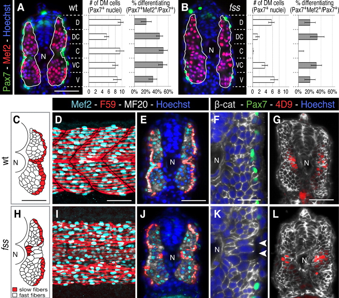 (A,B) Cross-sections and graphs showing dorsal-ventral distribution of dermomyotome (average of Pax7+ cells ± s.e.m.) and % differentiating dermomyotome (Pax7+/Mef2+) in wild type sibling and fss/tbx6 mutant (green, Pax7; red, Mef2; blue, Hoechst 33258). (C–L) Myotome morphology in wild type siblings (D–H) and fss/tbx6 (I–M) at the 24h stage. (C,H) Tracing of fast (white) and slow (red) muscle fibres on representative cross-sections. In fss/tbx6 mutants, the layer of slow fibres is disrupted and large fast muscle fibres are found lateral to the slow fibres in the central myotome. (D,E,I,J) Whole mounts (posterior trunk) and cross-sections labeled with F59 (red, labels slow myosin heavy chain at the 24h stage), Mef2 (aqua) and MF20 (white). (F,G,K,L) β-catenin labeled cross-sections double-labeled for either Pax7 (green, F,G) or 4D9 (red, engrailed, G,L); nuclei labeled with Hoechst. Arrowheads indicate large diameter, lateral fast fibres. N, notochord. Scale bars: 50 μm (A,C–E,G), 25 μm (F). Corresponding images of fss are to the same scale.