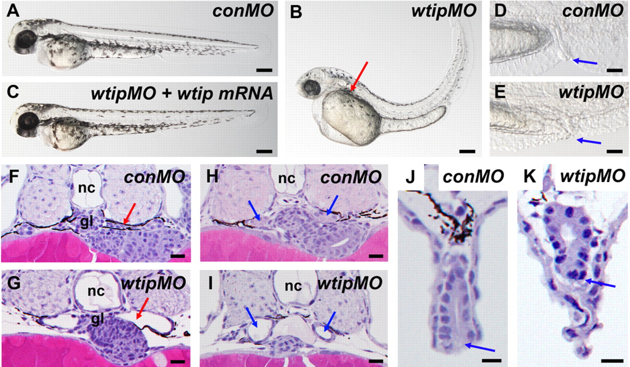 (A,B,C) Side view of embryos at 48 hpf under light microscopy. (B) 48 hpf wtip morphants form pronephric cysts, hydrocephaly, body curvature and pericardial edema. The red arrow marks the location of the cyst dilation (B). (D,E) Lateral view of cloaca at 48 hpf. The blue arrow marks the cloaca. (C) wtip mRNA can rescue pronephric cyst, body curvature, hydrocephalus, and pericardial edema caused by wtipMO. Histological transverse-sections of 48 hpf embryos are 4µm JB-4 plastic sections stained with hematoxylin and eosin (F–K) at the level of the glomerulus (F,G; red arrow), anterior pronephros (H,I; blue arrow), and cloaca (J,K; blue arrow). Glomerular cysts (G), dilated anterior pronephros (I) and cloaca malformation (K) were observed in the 48 hpf wtip morphants. Control morpholino injected embryos (conMO), wtip morpholino injected embryos (wtipMO), glomerulus (gl), and notochord (nc). Scale bars are 200 μm in A–C, 500 μm in D,E, and 100 μ in F–K.
