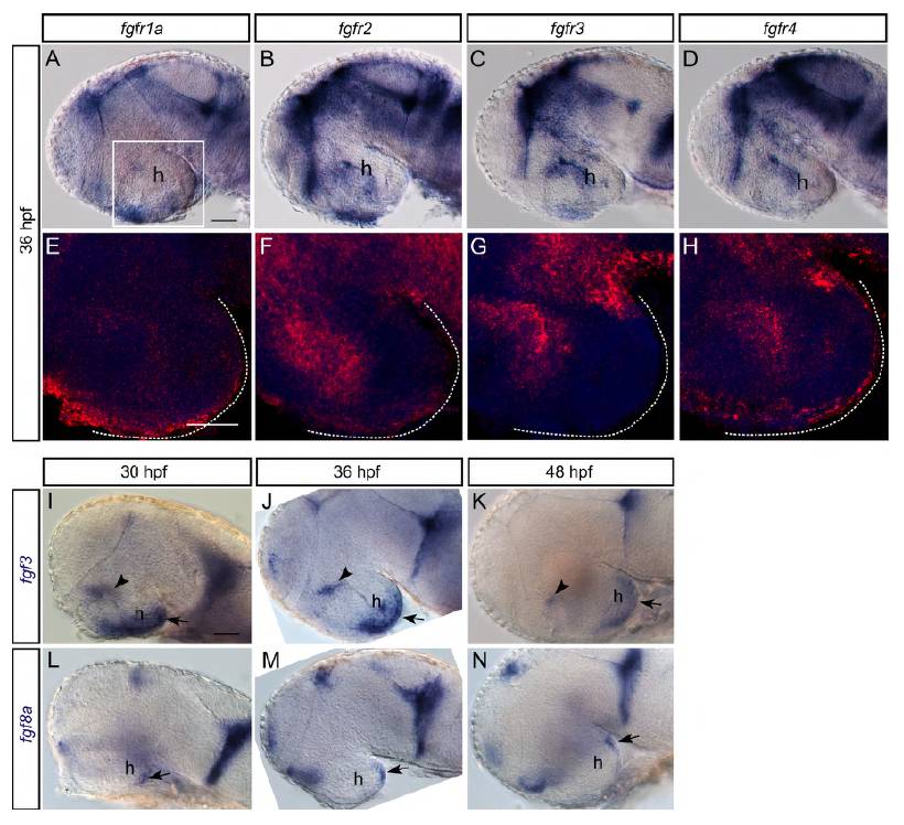 Fig. S6 Fgf receptors and ligands are expressed in the hypothalamus at a stage when 5-HT progenitors are proliferating. (A-D) fgfr1a, 2, 3 and 4 expression in whole-mount embryos. (E-H) Confocal maximum intensity projections of embryos processed for fluorescent ISH (red) and counterstained with DAPI (blue) covering 30 μm around the midline corresponding to boxed area in A. Transcripts for fgfr1a, 2 and 4, but not fgfr3, were detectable in the caudal hypothalamus (dashed line). (I-N) Expression of fgf3 and fgf8a in whole-mount embryos. At all stages analysed, both transcripts were detectable in the hypothalamus (h). However, fgf3 exhibited a broader expression domain covering the entire caudal/ventral hypothalamus (arrows) and a restricted part of the posterior tuberculum/hypothalamus (arrowheads) (I-K), whereas fgf8a was limited to an area in the most caudal/dorsal hypothalamus (arrows) (L-N). Lateral views, anterior left. Scale bars: 50 μm.