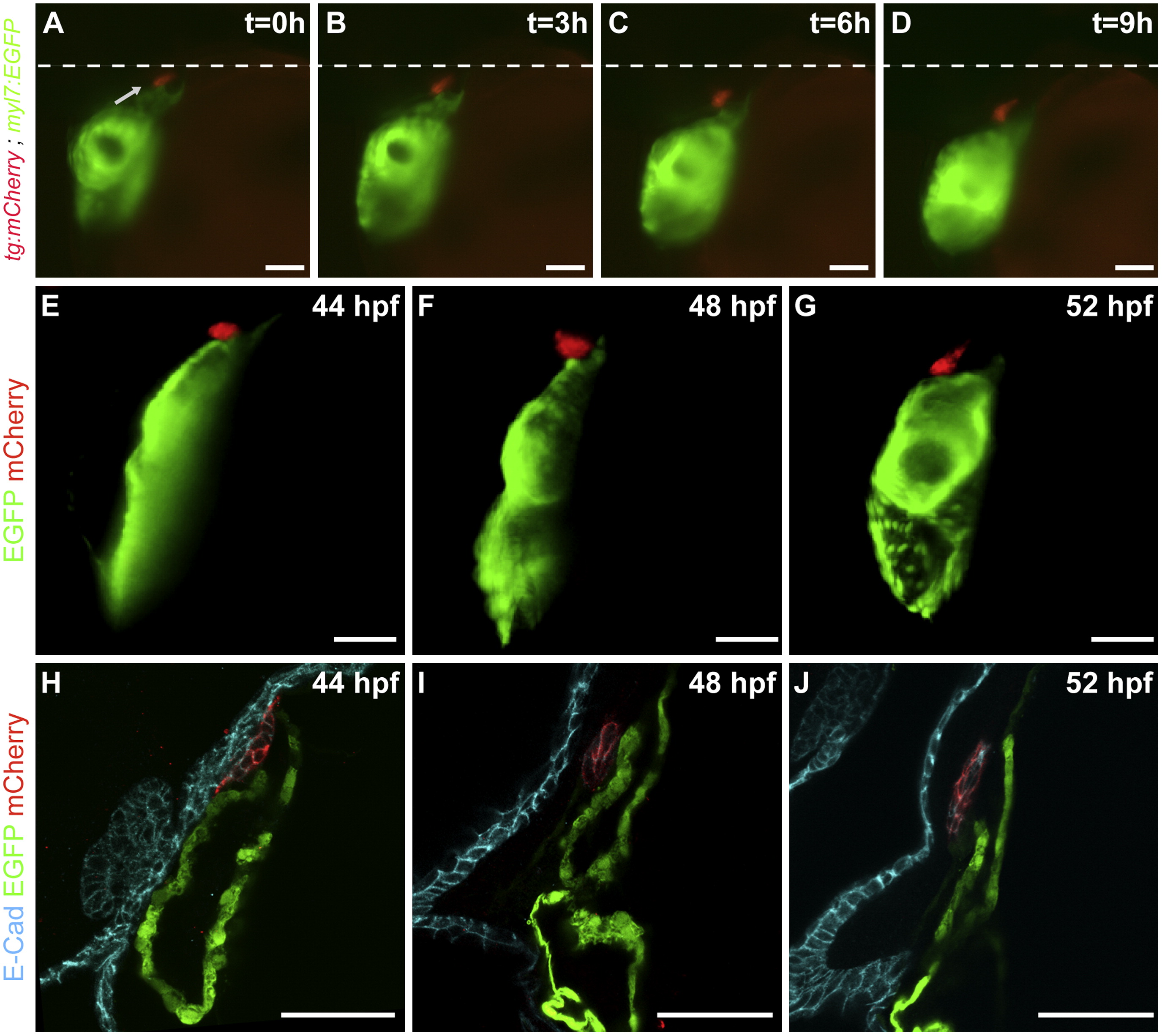 Fig. 3 Early thyroid morphogenesis occurs in close spatial proximity to the apical pole of the heart. ((A)-(D)) Stills from a time-lapse movie of a tg(tg:mCherry;myl7:EGFP) embryo showing that thyroid budding and relocation from the pharynx is highly coordinated with the descent of the heart. EGFP labels the myocardium and mCherry the thyroid. Live imaging was started at 38 hpf and lasted for 17 h. The timer indicates the time elapsed since the beginning of live imaging. Lateral views are shown. The dotted line facilitates visualization of the relative movement of the thyroid (arrow in (A)). ((E)-(J)) Whole-mount IF staining of tg(tg:mCherry;myl7:EGFP) embryos confirmed the intimate contact between thyroid primordium and distal ventricular myocardium during thyroid invagination from the pharynx. Panels (E)-(G) show epifluorescence images of whole mount embryos. Panels (H)-(J) show confocal images of sagittal vibratome sections of stained embryos. mCherry, EGFP and E-Cadherin label thyroid primordium, myocardium and foregut epithelium, respectively. In all panels, anterior is to the left. Scale bar: 50 μM.