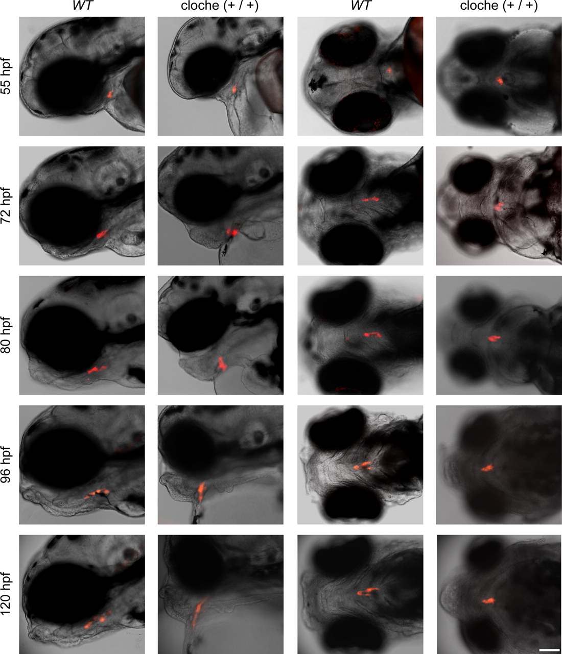 Fig. S2 Live imaging of thyroid development in wild-type (WT) and cloche embryos expressing mCherry in thyroid cells. The two columns on the left show lateral views and the two columns on the right show ventral views of embryos that were transiently embedded in low melting agarose for live imaging at the indicated time points. The normal expansion of thyroid tissue along the pharyngeal midline seen in WT embryos was defective in cloche embryos. Note that the progressive increase of the pericardial edema caused a marked disruption of the normal morphogenesis of the hypobranchial region as a whole. Merged images from brightfield and epifluorescence microscopy are shown. Scale bar: 100 μM.