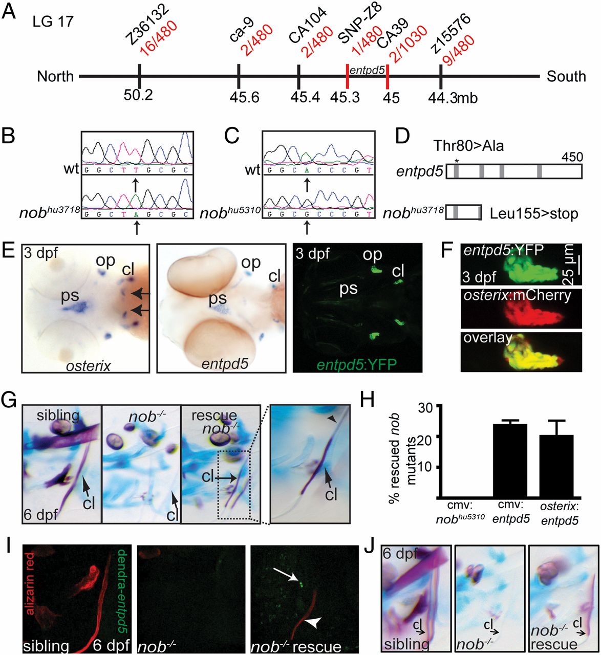 Fig. 2 Nob mutants encode entpd5, which is specifically expressed in osteoblasts. (A) Meiotic map of the nobhu3718 locus. Recombinants per total number of mutants tested for each polymorphic marker are depicted in red, and markers used for mapping are in black. (B) Sequencing of nobhu3718 revealed a Leu155>stop mutation. (C) Sequencing of nobhu5310 revealed a Thr80>Ala mutation transversion. (D) Schematic representation of the predicted protein structures for Entpd5 and nobhu3718. The asterisk indicates the position of the mutation in nobhu5310. Gray bars, apyrase domains within Entpd5 (35). See also Fig. S1. (E) (Left and Center) Entpd5 and osterix are almost identically expressed in 3-dpf embryos, with osterix expression in the region of future teeth (arrows) being the single exception at this stage. (Right) Representative image of a 3-dpf entpd5:YFP transgenic embryo showing an expression pattern that matches endogenous entpd5 transcript distribution (Center). (F) Coexpression of entpd5:YFP and osterix:mCherry in the operculum of 3-dpf embryos. (G and H) entpd5 cDNA injection (CMV promoter) into nobhu3718 mutants results in mosaic mineralization (G). Arrows point at cleithra in G; the arrowhead points to a nonmineralized osteoid in a partially mineralized cleithrum. Bar graphs in H represent percentages of rescued mutant embryos at 6 dpf (expressed as mean ± SEM, three independent experiments). (I) Alizarin red staining of a mutant nob embryo that had been injected with a cmv:dendra-t2a-entpd5 expression construct at the one-cell stage. The cleithrum is partially mineralized in the mutant (arrowhead); however, there are no dendra-positive cells immediately abutting the mineralized structure (arrow). (J) Representative example of an embryo partially rescued by endothelial-specific expression of entpd5 (kdr-like:entpd5).