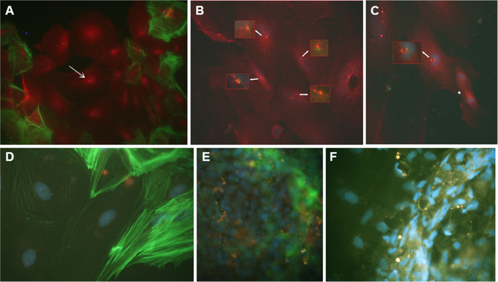 Fig. 5 Co-location of MAb Tit1 5 H1.1 target antigen (titin) with F-actin and Î3-tubulin, negative staining with secondary antibodies,and the inhibition of specific staining of MAb Tit1 5 H1.1 with subpeptide N-AVNKYG-C in cells of zebrafish. (A) The cells of zebrafish testes were cultivated for 3 days, fixed, permeabilized, and double labeled with Alexa Fluor 488 conjugated to Phalloidin for F-actin (green) and with the MAb Tit1 5 H1.1 primary antibody for titin (specific staining with Alexa Fluor 594 conjugated to goat anti-mouse IgG secondary antibody (red). Arrow shows centriole staining. Note also a strong staining of nuclei and cytoplasm (obj. 40x). (B) The cells of zebrafish testes were double labeled with MAb Tit1 5 H1.1 for titin (red) and with rabbit anti-human Î3-tubulin for Î3-tubulin (green). Note the individual staining of the target antigens of both antibodies with centrioles/centrosomes. Arrows show centrosome/centriole staining.(C) Double labeling of mitotic cells of zebrafish with MAb Tit1 5 H1.1 for titin (red) and with rabbit anti-human Î3-tubulin for Î3-tubulin (green). The long arrow shows the co-location of MAb Tit1 5 H1.1 antigen (titin) and Î3-tubulin in the mitotic spindle with separated double-labeled centrioles (yellow stain), and the short arrow shows a late anaphase (only titin is labelled, red stain).(D) Negative staining of cells with secondary antibodies. (E,F) The cells were stained with MAb Tit1 5 H1.1 for titin but inhibited by the subpeptide N-AVNKYG-C. Note a full absence of staining with Alexa 594. Cell nuclei were stained blue with DAPI (obj. 100x).
