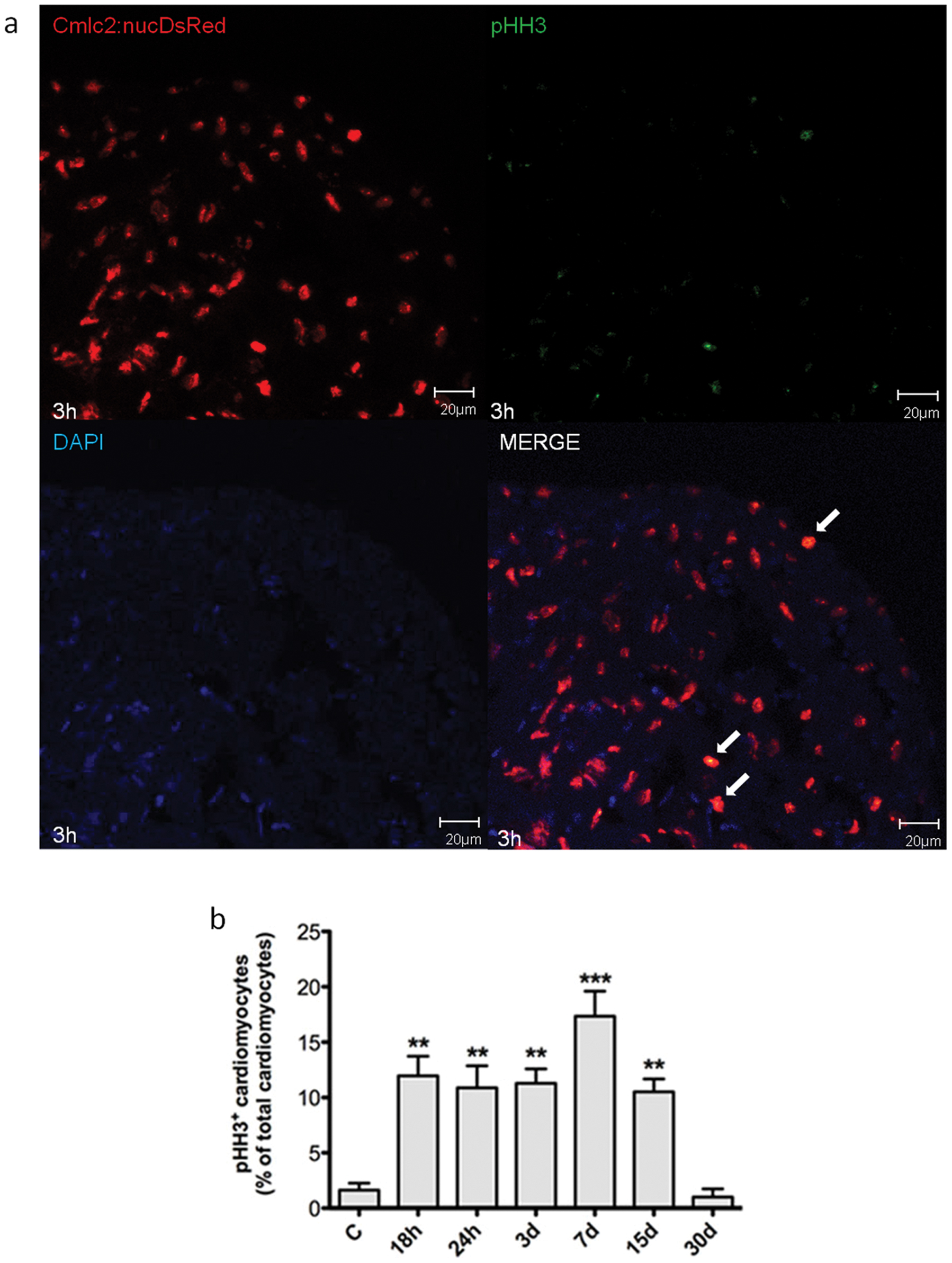 Cardiomyocytes proliferation was assessed under baseline conditions and 18 h to 30d after H/R in Tg(cmlc2:nucDsRed) zebrafish line. (a) Representative image of a zebrafish heart ventricular section 3d after H/R showing colocalization of DAPI, DsRED and pHH3 stainings. Arrows indicate cardiomyocyte pHH3+ nuclei. (b) The increase in pHH3+ cardiomyocytes was apparent 18 h after H/R, achieved its peak at the 7d time point and was back to baseline at the 30d time point (n = 3 at each time point; ** p<0.01 and *** p<0.001 vs. C).