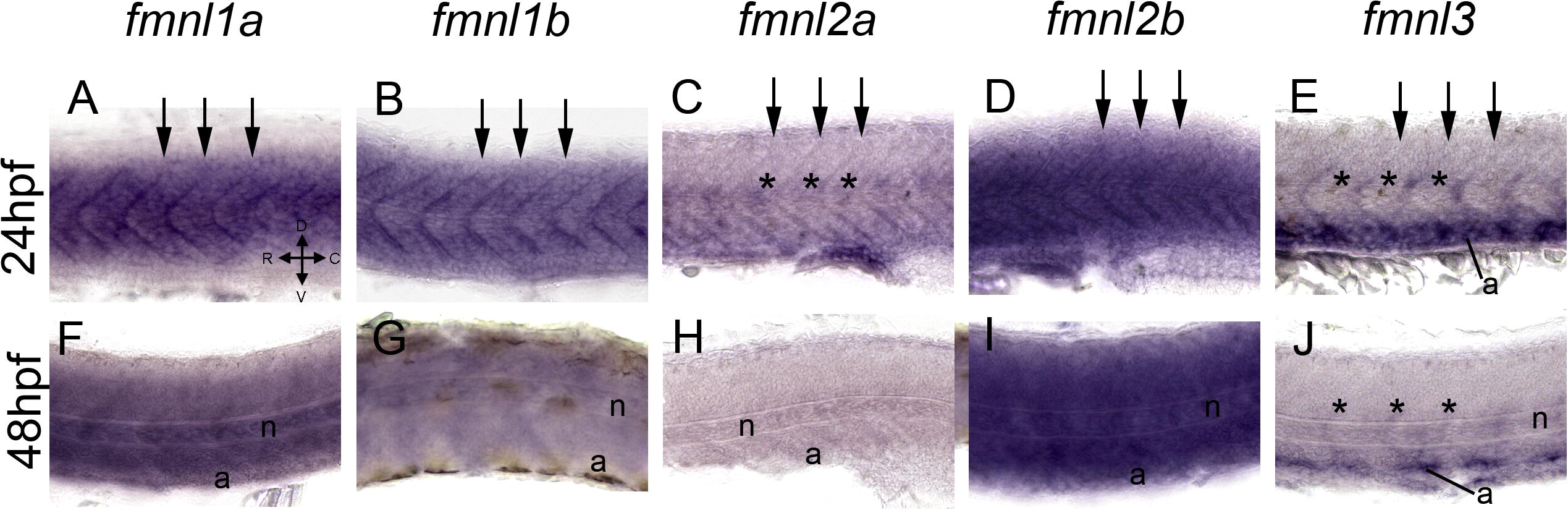 Fig. 5 Expression of fmnls in the trunk of larvae at 24 (A-E) and 48 (F-J) hpf. At 24 hpf fmnls were robust in the myotome boundaries (arrows) and fmnl2a and 3 were also expressed in the intersomitic vessels (asterisks) and fmnl3 in the aorta (a) (E). At 48 hpf fmnl1a, 1b and 2b were robust in the notochord (n) (F, G, I) and fmnl3 persisted in the aorta and the intersomitic vessels (asterisks in J).