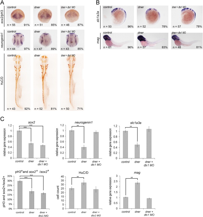 Fig. 9 Dner is mediated by Deltex1 in neuronal and glial cells but not in neural progenitors. (A) dner injection decreased the proliferation of neural progenitors, and this could not be restored by co-injection with deltex1 morpholino. (A–B) dner overexpression induced neuronal and glial differentiation, and these effects were abolished by deltex1 knockdown. (C) qPCR analysis confirmed the results of the in situ hybridization shown in A–E. NN, p<0.01; NNN, p<0.001.