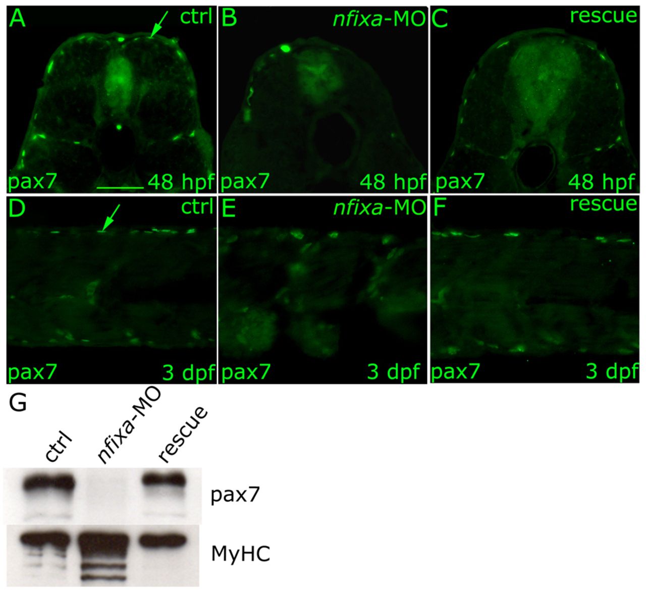 Fig. 7 The absence of Pax7-positive progenitor cells in nfixa-MO-injected embryos determines the loss of secondary fibers. (A-F) Immunohistochemistry experiments with the Pax7 antibody that recognizes secondary fiber precursors. Pax7-positive secondary fiber progenitors at the dorsal and ventral extremes of the superficial muscle monolayer did not form in 48 hpf and 3 dpf nfixa-MO-injected embryos (B,E) in comparison with controls (A,D arrow), whereas they are recovered in rescued embryos (C,F). (G) Western blot: secondary fiber precursors were recognized by Pax7 antibody, all sarcomeric myosins MyHC were recognized by MF20 antibody. In isolated tails of nfixa-MO-injected larvae, Pax7 protein levels were higher than the control whereas they were recovered in rescued embryos at 3 dpf. All myosin protein levels were higher in nfixa-MO-injected larvae, as expected. (A-C) 48 hpf transversal sections, dorsal on top. (D-F) 3 dpf longitudinal sections, anterior towards the left. Scale bar: 100 μm.