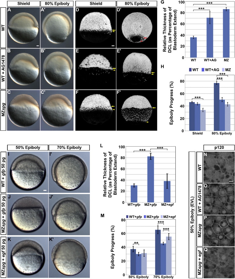 Fig. 5 EGF Signaling Controls DCL Thinning and Epiboly Progression (A–F′) Phenotypes of WT, EGFR inhibitor AG1478-treated WT, and MZspg embryos at shield stage and 80% epiboly. (A–C′) Images of live embryos. (D–F′) Confocal z-projection of cell nuclei stained with Sytox green in fixed embryos. Lateral views, animal pole to the top. Scale bars, 50 μm.(G and H) Quantification of relative DCL thickness at shield and epiboly progress at shield and 80% epiboly stages following EGFR inhibition (p < 0.001; n = 12 embryos each; error bars show SEM). (I–K′) Live epiboly phenotypes of control gfp mRNA-injected WT (I and I′), gfp mRNA-injected MZspg (J and J′), and egf mRNA-injected MZspg embryos (K and K′). Lateral views, animal pole to the top. Scale bar, 50 μm. (L and M) Quantification of DCL thickness at 50% epiboly and epiboly progress at 50% epiboly and 70% epiboly stages following egf mRNA injection (error bars show SEM; p < 0.01, p < 0.001; n = 12 embryos each).(N–Q) Confocal images of anti-p120 whole-mount immunofluorescence at 50% epiboly, conditions as indicated. Animal views. Scale bar, 10 μm.See also Figure S4 and Movie S3.