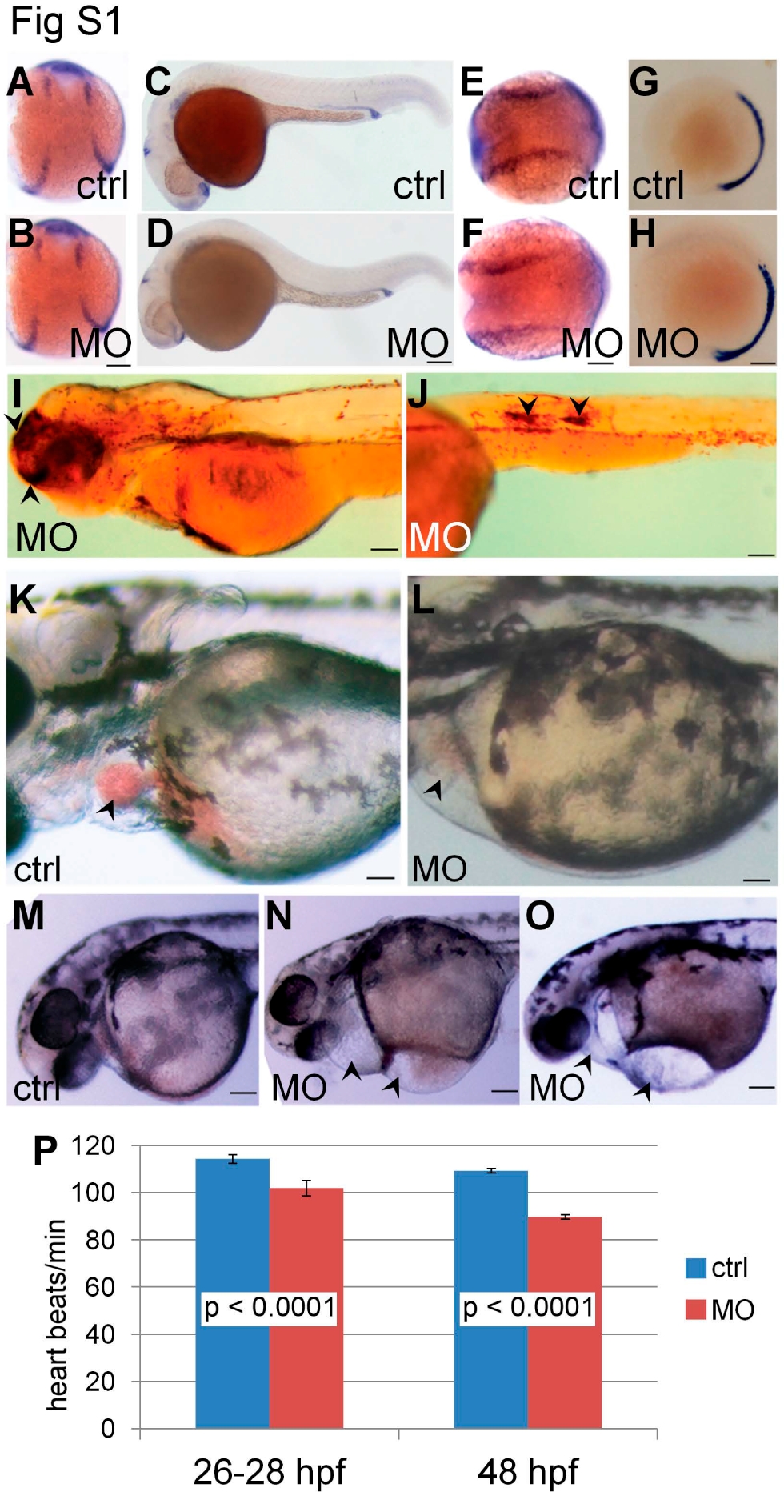 Patterning and morphology in hoxd4a morphants. (A–H) Knockdown of hoxd4a does not perturb overall patterning of the mesoderm. (A–D) Expression of pax2.1 shows that intermediate mesoderm forms and matures normally in hoxd4a morphants at 13 hpf (B) and 26–28 hpf (D) vs controls (A,C). (E,F) nkx2.5 expression in the precardiac lateral plate mesoderm at 13 hpf is normal in control (E) and morphant embryos (F). (G,H) myod expression in paraxial mesoderm is normal in control (G) and morphant embryos (H). Images in C, D, G and H are lateral views with anterior to the left. A, B, E and F show dorsal views with anterior to the top (A,B) or left (E,F). (I to O) Lateral views of control and hoxd4a-MO-injected larvae at 72 hpf. (I,J) Staining of hemoglobin with o-dianisidine reveals areas of hemorrhage such as in the head (I, arrowheads) and trunk (J, arrowheads) in some hoxd4a morphants. (K,L) Control larvae (K) but not hoxd4a morphants (L) show abundant RBCs passing through the heart (arrowheads). (M–O) Unlike control larvae (M), hoxd4a morphants display pericardial edema and edema over the adjacent yolk (N,O, arrowheads). Scale bars equal 100 μm. (P) The heart rate in morphants at 26–28 and 48 hpf was mildly reduced, but in a statistically significant manner as determined by unpaired Student’s t test (p<0.0001). Error bars give standard deviation.