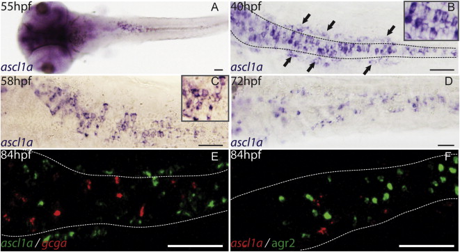 Fig. 1 ascl1a is expressed in the precursor cells of the gastrointestinal tract. Ventral views with anterior on the left of embryos analyzed by visible WISH (A–D) or double fluorescent WISH (E and F). (A) General view of ascl1a expression domain at 55 hpf. (B) At 40 hpf, ascl1a is expressed in cuboïdal cells scattered in the primitive intestine (dotted lines) and in enteric neurones that lined these cells (arrows). (C) At 58 hpf, this scattered expression is still intense. (D) At 72 hpf, the number of ascl1a expressing cells begins to decrease along the gastrointestinal tract. (E and F) Confocal sections showing that ascl1a is not expressed in the mature enteroendocrine cells labeled by the gcga probe (E) neither in the mature goblet cells labeled by agr2 (F). Scale bars: 50 μM.