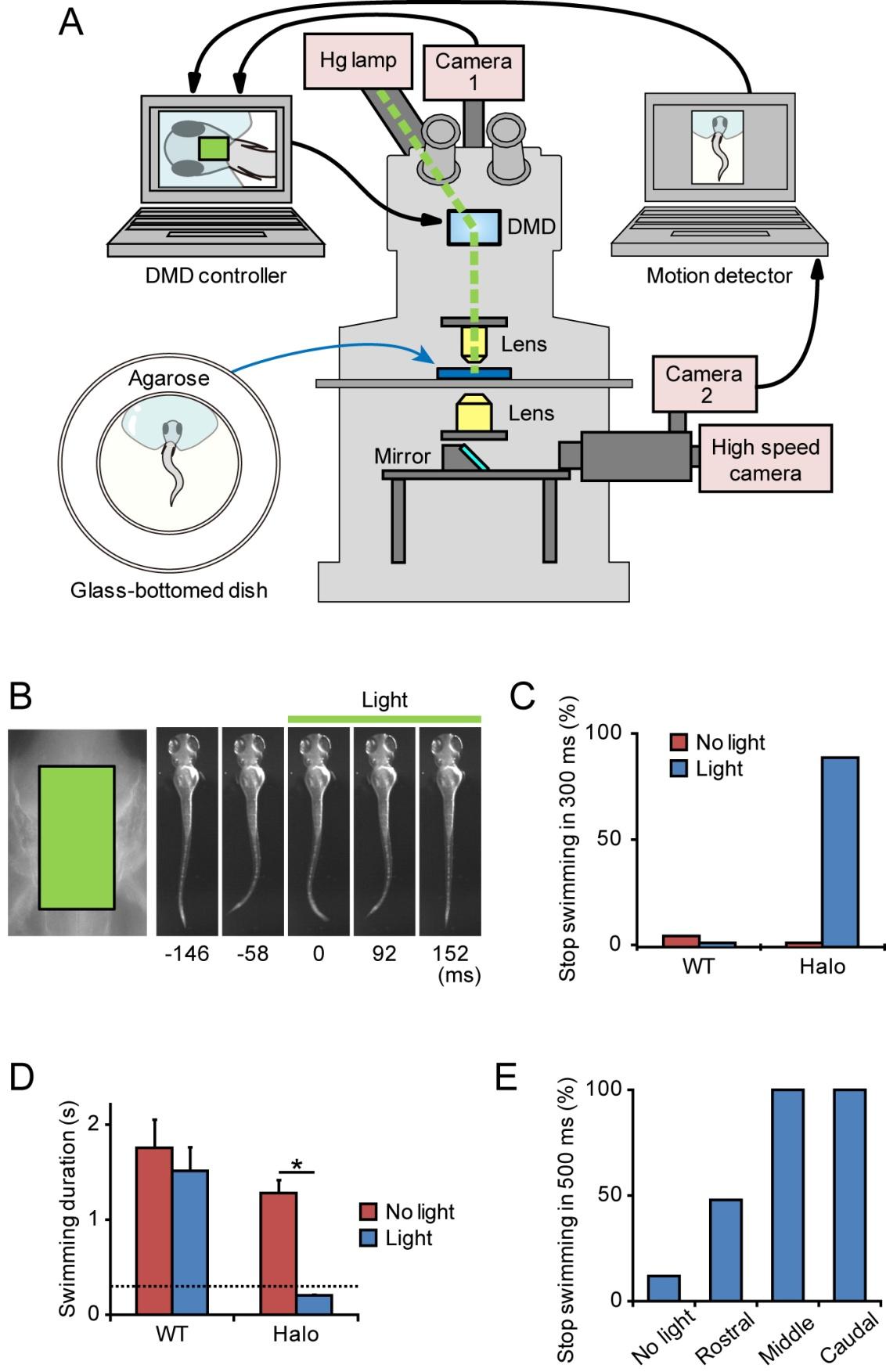 Fig. S3 Inactivation of hindbrain V2a neurons stops on-going swimming (A), A schematic of the experimental setup. The setup is essentially identical to that of the ChR photo-stimulation experiments (Fig. S2A), except that it contains a camera2 and computer for motion detection. The light-path from the bottom part is divided into two, with one reaching the high-speed camera and the other reaching camera2. Images of camera2 are digitized in the computer, and larval motion is detected. After detecting motion, an electronic signal is sent to the other computer (DMD controller) to start illumination by controlling DMD. (B) - (E), Inactivation of hindbrain V2a neurons with Halo3. Compound transgenic fish of Tg[chx10:Gal4] and Tg[UAS:Halo3] at 3 dpf were used in the experiments. (B), (C), and (D), Green light (7.6 mW/mm2, 300 ms) was applied to the boxed area (left panel in B) after swimming started (onset latency of the illumination was 200–400 ms). The application of the light stopped swimming (right panels in B). (C), Frequencies of stopping swimming within the illumination periods (300 ms). “WT” represents wild-type larvae, whereas “Halo” represents larvae that expressed Halo3 in V2a neurons. “No light” represents control experiments in which green light was not applied. In these cases, the duration of swimming was measured after the onset of the electric signal that would turn on illumination with the DMD. In 90% of the trials, illumination of the green light stopped on-going swimming in Halo3-expressing larvae. Halo3: n = 27, 6 animals; WT: n = 25, 6 animals. (D), Mean duration of swimming after the onset of illumination. Bars indicate SE. The dotted line indicates illumination time. In the case of Halo3-expressing larvae, the duration of swimming was significantly shorter (t-test; *p <0.001). Halo3: n = 27, 6 animals; WT: n = 25, 6 animals. (E), Green light (7.6 mW/mm2, 500 ms) was applied in a region-specific manner. Illumination areas are the same as the ones shown in Figure 3D. Frequencies of stopping swimming within the illumination periods (500 ms) are shown. “No light” represents control experiments in which green light was not applied. n = 25, 7 animals.