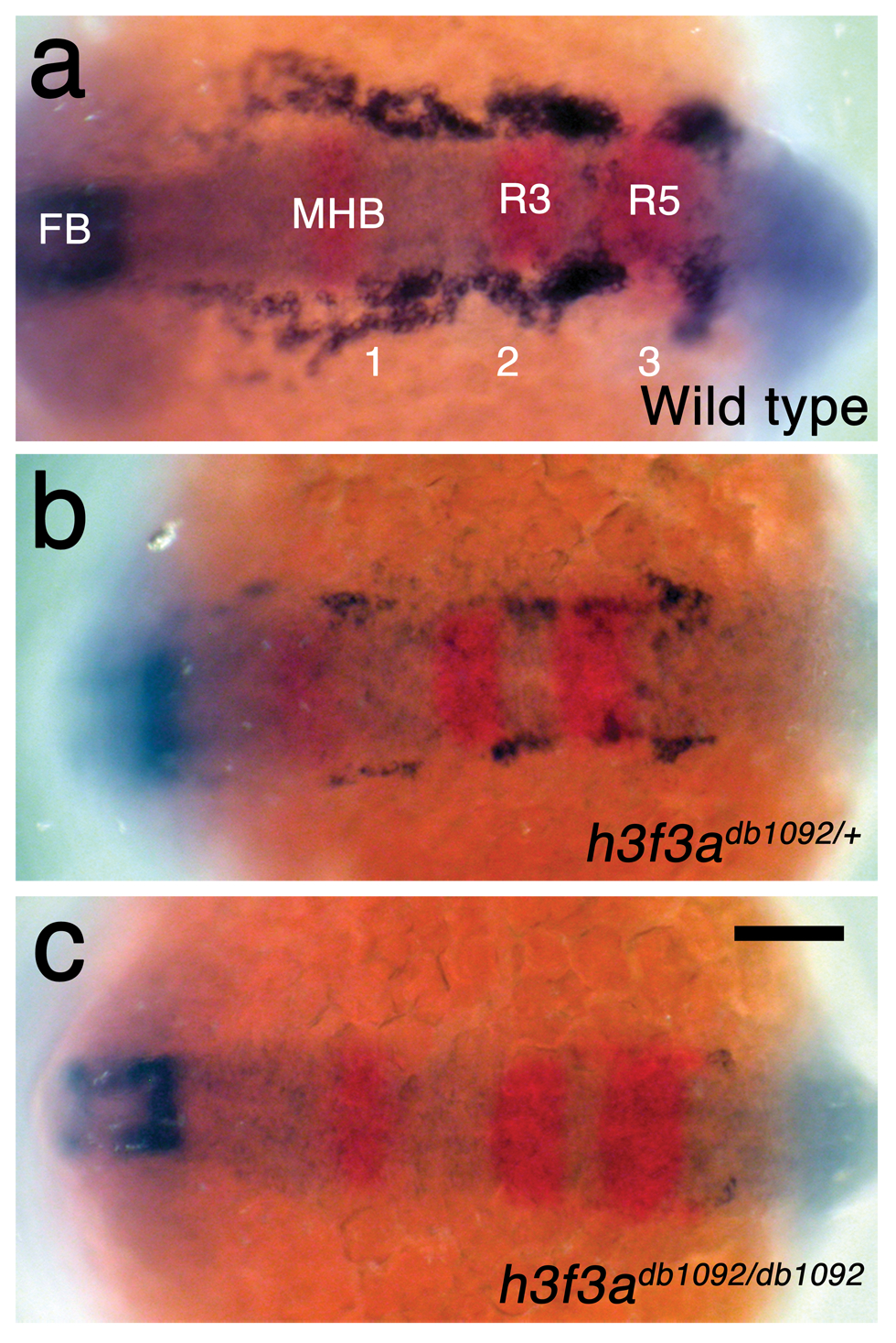 Fig. S5 h3f3adb1092 embryos lack CNC ectomesenchyme but have normal neural patterning. a, In wild-type embryos at 15.5 hpf, expression of dlx2a (blue) marks a subset of the forebrain (FB) and three streams of migrating CNC-derived ectomesenchyme (1–3). In red, pax2a expression marks the mid-hindbrain boundary (MHB) and egr2b expression marks rhombomeres 3 and 5 (R3 and R5) of the hindbrain. b, c, dlx2a-positive ectomesenchyme is reduced (n = 18/18) in h3f3adb1092/+ heterozygous embryos and completely lost (n = 3/9) or greatly reduced (n = 6/9) in h3f3adb1092 homozygotes at similar stages. Neural patterning was never affected in h3f3adb1092 heterozygotes and homozygotes. Scale bar = 100 μm.