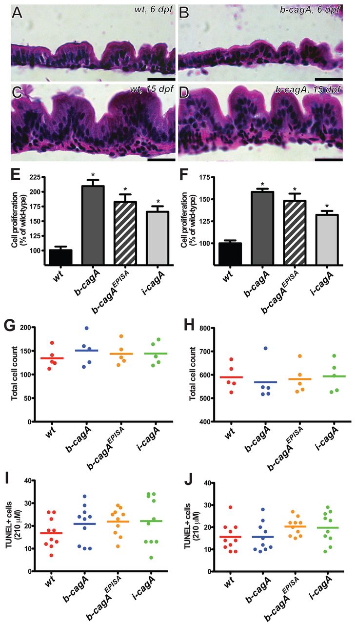 Fig. 2 CagA expression causes overproliferation of the intestinal epithelium. (A,B) H&E stained sagittal sections of wild-type (A) and b-cagA transgenic (B) zebrafish intestine at 6 dpf. (C,D) H&E stained sagittal sections of wild-type (C) and b-cagA transgenic (D) zebrafish intestine at 15 dpf. (E,F) Intestinal epithelial cell proliferation at 6 dpf (E) and 15 dpf (F). Bars represent proliferation (mean ± s.e.m.) as a percentage of wild-type; n=10, *P<0.05 using one-way ANOVA with Tukey’s test. (G,H) Total intestinal epithelial cell counts of single H&E stained midline sagittal sections at 6 dpf (G) and 15 dpf (H). (I,J) TUNEL-positive cells in the intestinal epithelium at 6 dpf (I) and 15 dpf (J). Scale bars: 10 μm.