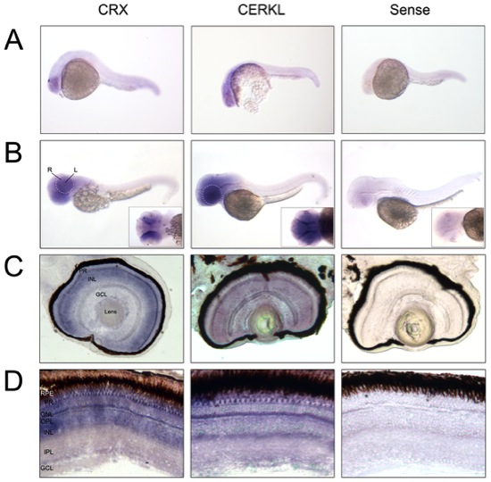 (A and B) Whole-mount RNA in situ hybridization analysis showing cerkl expression in the retina and brain of embryos at 24 and 50 hpf. R, retina; L, lens. (C and D) In situ hybridization on zebrafish retina cryosections of 72 hpf embryos and adult tissue. Cerkl expression is detected in the three nuclear layers of the embryo retina, whereas adult expression appears in the inner segment of the photoreceptors and some cells located at the basal layer of the INL. Positive control (antisense CRX), strongly labels the inner photoreceptor segment and inner nuclear layer. The negative control was performed with sense cerkl. RPE, retinal pigment epithelium; PR, photoreceptor; ONL, outer nuclear layer; OPL, outer plexiform layer; INL, inner nuclear layer; IPL, inner plexiform layer; GCL, ganglion cell layer.