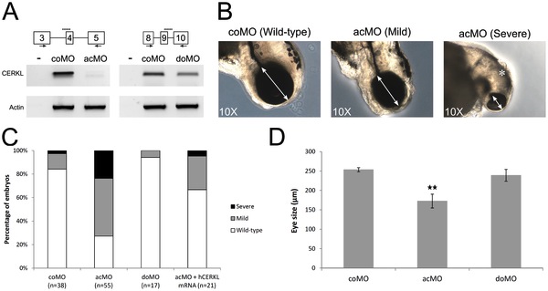 (A) Two morpholinos targeting an acceptor (acMO) and donor splice site (doMO) of ZFcerkl were used. The morpholino targeting site is depicted by a discontinuous line. To assess the knockdown effect, a RT-PCR analysis of control and ZFcerkl morphants injected with 8 ng of MO was performed (primers used are depicted with arrows). Silencing with acMO was almost complete, when compared with cerkl expression in 72 hpf control MO-injected embryos (coMO), whereas in doMO animals the WT spliced isoform was decreased by 35%. β-Actin was used for normalization. (B) acMO-injected embryos displayed either small eye phenotype (named mild phenotype) or very small eye, small head, and body and curved tail (named severe phenotype). White double-head arrows denote diameter of the eyes. * denotes small and curved head in severe-phenotype morphants. (C) Phenotype frequency of morphants. The cerkl-knockdown phenotype was rescued when human CERKL mRNA was co-injected with acMO. n, number of individuals. (D) Eye size (in diameter) was measured in at least ten independent embryos from each group. Data were analyzed by t-test and are presented as mean ± SEM. ** P<0.001. Mean eye size was 253.4 µm for control, 172.7 μm for acMO and 239 μm for doMO morphants.