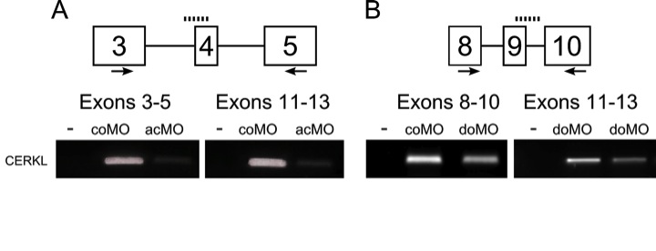 Fig. S3 Validation of cerkl morpholinos. Transcriptional products obtained with the following sets of primers: (A) exons 3-5 and 11-13 for acMO samples, and (B) exons 8-10 and 11-13 for doMO samples. The comparable decrease in band intensity suggests transcript depletion in both cerkl morphants.