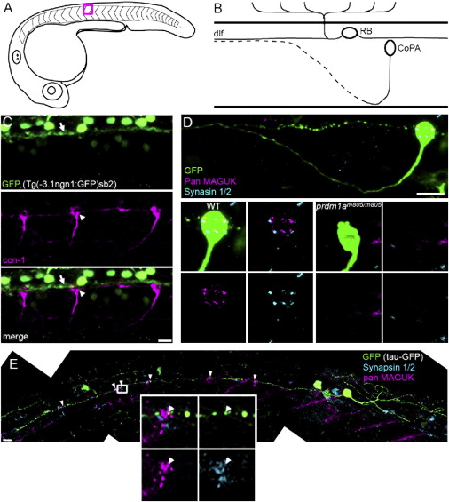 Fig. 1 RBs Synapse onto CoPA Interneurons (A) Diagram of a lateral view of a 25 hpf zebrafish embryo. Studies were performed between segments 11 and 15. Red box outlines segment 12, the region represented in (B). (B) Diagram depicting the cell body location and axon trajectories of an RB cell and a CoPA cell, in a lateral view of the developing spinal cord. The dotted axon represents a contralateral projection. (C) CoPA cell bodies (white arrowhead), labeled with con-1 antibody (magenta), were in close proximity to RB axons expressing GFP (white arrow), in ngn1:GFP transgenic embryos. Scale bar represents 10 μm. (D) pan MAGUK (magenta) and synapsin 1/2 (cyan) immunolabeling on WT and prdmm805/m805 embryos with Tau-GFP-labeled CoPA cells. Top panel: shows axon projections and cell body of a CoPA cell in WT embryo. The cell body is shown at higher magnification in bottom left 4 panels, to highlight overlap of pre and postsynaptic puncta. Lower right four panels: no pre- or postsynaptic puncta were seen on CoPA cell bodies in prdmm805/m805 embryos, lacking RB cells. Scale bar represents 10 μm. (E) Composite image of a RB cell expressing GFP (green), including the entire central axon extending rostrally, with labeling for synapsin 1/2 (cyan) and pan MAGUK (magenta). Distinct clusters of colocalized pan MAGUK and synapsin 1/2 immunofluorescence were at CoPA cell bodies, see arrowheads. Inset shows distinct MAGUK and synapsin 1/2 puncta, arrowhead indicates a MAGUK puncta adjacent to a synapsin 1/2 puncta that is within a varicosity in the GFP-expressing RB axon. Scale bar represents 10 μm. See also Movie S1.