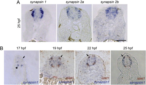Fig. S1 Zebrafish synapsin Genes Are Expressed in RBs, Related to Figure 3 (A) In situ hybridization (ISH) for zebrafish synapsins1, 2a, and 2b at 25 hpf in transverse sections. synapsin1 showed the strongest expression of the three in RBs. Scale bar 50 μm. (B) synapsin1 ISH on 17, 19, 22, and 25 hpf transverse sections (2 color ISH with islet-1 to label RBs and motor neurons in 19, 22, and 25 hpf images). synapsin1 transcript was first seen at 17 hpf in motor neuron domain (arrowhead), but not in RBs (arrow). synapsin1 and islet1 were seen in RBs from 19 hpf on (arrows). Scale bar 50 μm.