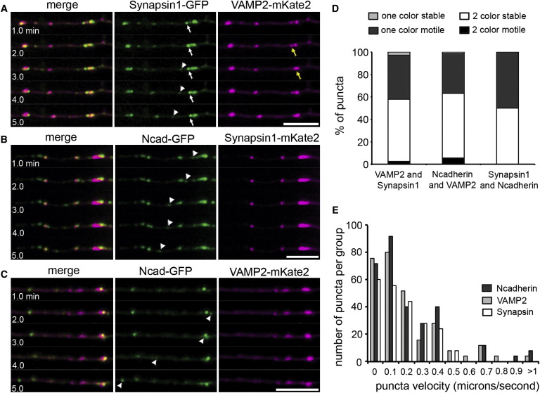 Fig. 4 Synapsin1, STVs, and PTVs Are Transported Independently of Each Other (A–C) Selected sequence of five frames, 1 min apart, from 30 min time-lapse movies showing differential transport of synapsin1-GFP and VAMP2-mKate2 (A), synapsin1-mKate2 and N-cadherin-GFP (B), and N-cadherin-GFP and VAMP2-mKate2 (C) in RB axons. Movies acquired between 24–26 hpf. Arrows and arrowheads highlight motile puncta that were positive for only one of the two fluorescent fusion proteins. A VAMP2-mKate punctum was initially paused (yellow arrow in A) and colocalized with a synapsin1-GFP punctum (white arrow), but then moved away (t = 3.0). Scale bars represent 10 μm. (D) Histogram showing the number of two color puncta versus single color puncta that are motile over a 30 min imaging period. Two color puncta are those labeled for both transport packet markers imaged in a given pair, single color puncta are those expressing only one of the two markers. Error bars represent SEM. p < 0.005.(E) Distribution of the number of each type of puncta (N-cadherin, VAMP2, synapsin) at each velocity. The maximum velocity measured for a synapsin1 puncta was 2.49- and 1.98-fold slower than the maximum velocity for an N-cadherin or a VAMP2 puncta, respectively. See also Figure S2 and Movie S2.