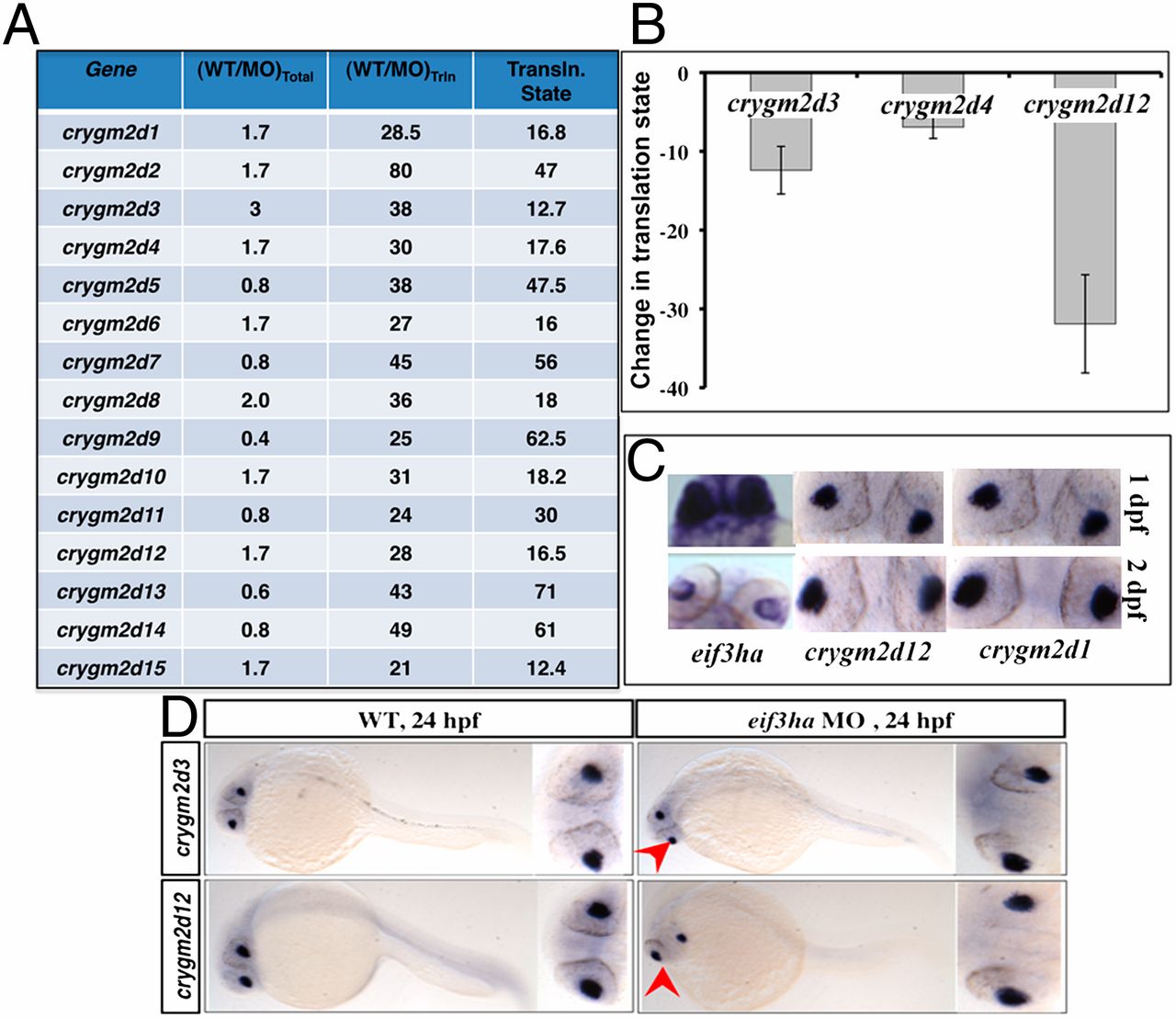 Fig. 4 Crystallins of the crygm2d family are a cohort of genes that are translationally regulated by eif3ha. (A) Transcripts encoding crygm2d isoforms are shown according to their respective changes in the translation state relative to total RNA. (B) The change in translational state was validated in independent experiments by qPCR for crygm2d3, crygm2d4, and crygm2d12. (C) Representative in situ hybridization experiment showing that crygm2d1, crygm2d12, and eif3ha transcripts are colocalized in the developing lens at 1–2 dpf. (D) Representative in situ hybridization experiment showing that transcript patterns for crygm2d3 and crygm2d12 are unaltered in eif3ha morphants at 24 hpf compared with stage-matched WT controls.