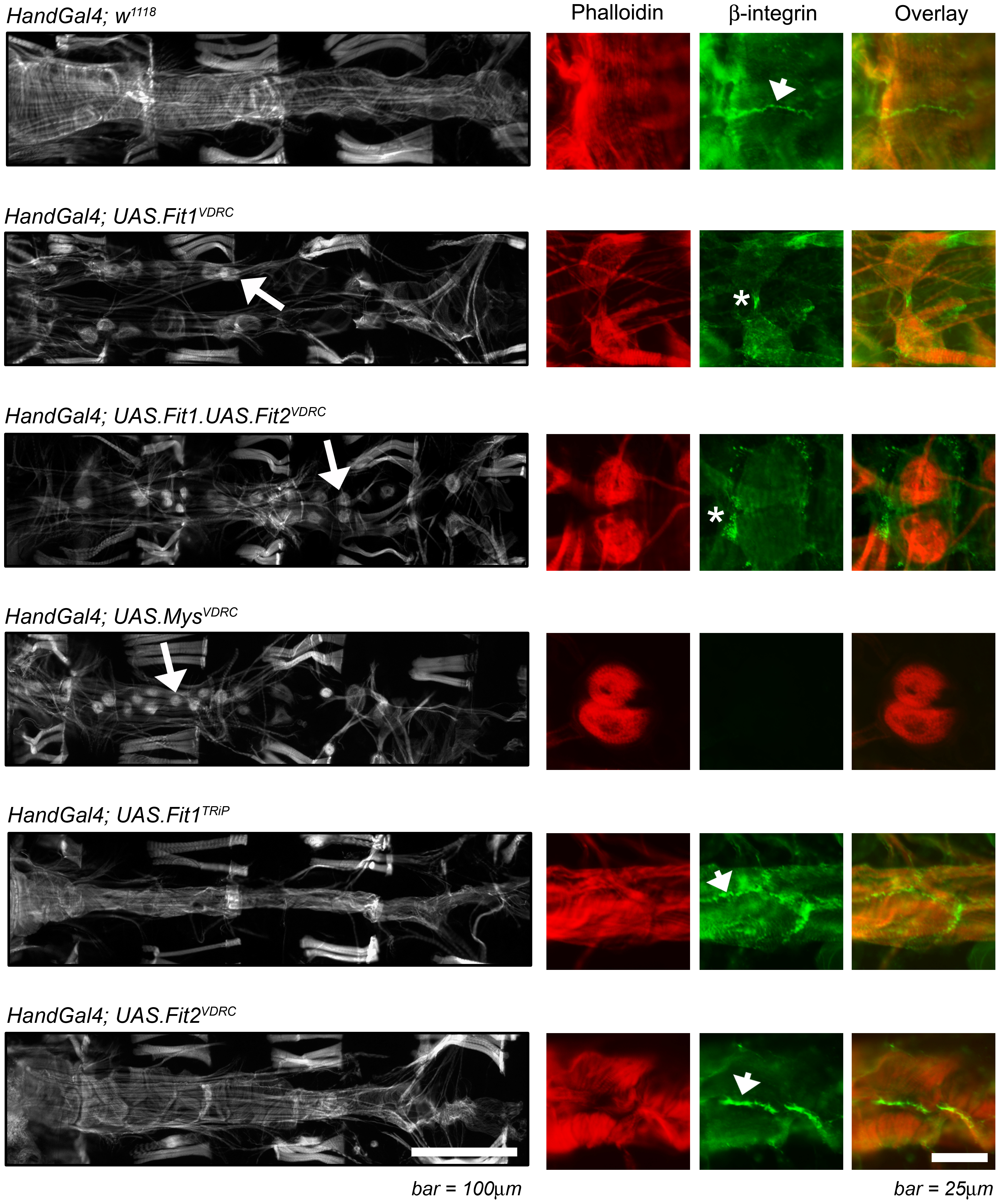 The monochrome micrographs show the adult Drosophila heart (segments A2 to A5) stained with phalloidin, oriented with the anterior region to the left. Genes were silenced using the Hand-Gal4 enhancer which drives expression in cardiomyocytes (as well as pericardial nephrocytes and enterocytes of the gut) and abnormal cardiomyocyte/heart morphology is highlighted by the arrows. The colour panels show higher magnification micrographs of at least two cardiomyocytes stained with phalloidin (red) and antibodies to the Drosophila β-integrin, myospheroid (green); arrowheads indicate normal integrin staining between cardiomyocytes; asterisks indicate an abnormal staining pattern associated with loss of cardiomyocyte junction integrity. A wild type phenotype (Hand-Gal4; w1118), is characterised by contiguous cardiomyocytes and β-integrin staining between cardiomyocytes.