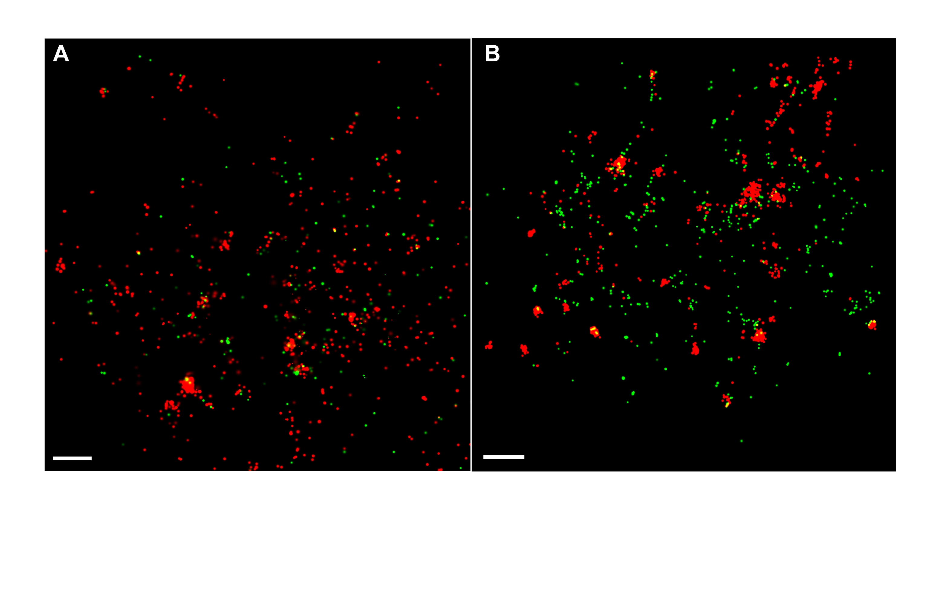 SHRV does not utilize caveolae to enter the host cell. FPALM imaging demonstrates no colocalization between fluorescently labeled virus and Cav-1b molecules early in the infection. Shown is a representative cell (total e8) of Cav-1b at 10 min post infection (A) and 2 h post infection (B). This indicates that SHRV does not use caveolae as a means of entry, suggesting that entry through caveolae will not be affected as a result of Cav-1 knockdown. For all images, 60×/1.2 NA. Scale bars, 1 μm.