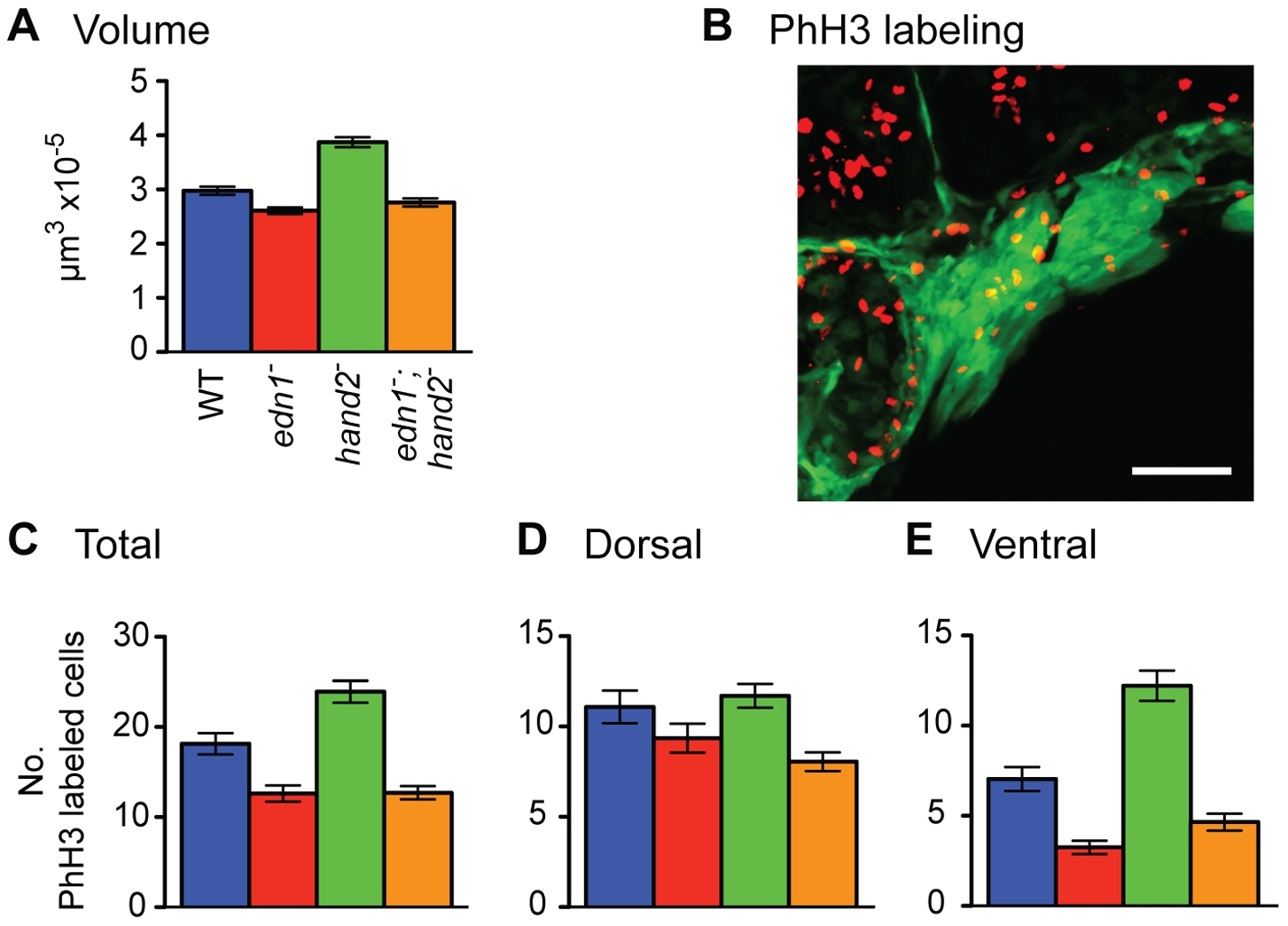 edn1 positively and hand2 negatively regulate the volume of pharyngeal arch fli1a:EGFP expressing mesenchyme (A) and ventral domain proliferation of neural crest derived cells (B–E).