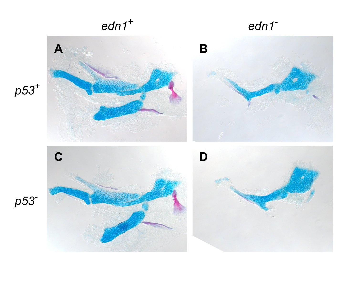 Loss of function of the programmed cell death gene p53 does not rescue the skeletal phenotype of the edn1 mutant. Flat-mount of cartilage and bone stained with Alcian Blue and Alizarin Red. The skeletal phenotypes of the edn1 single mutant and the edn1;p53 double mutant appear identical, whereas phenotypic rescue would be expected if programmed cell death of pharyngeal arch precursor cells accounted for the edn1 hypoplastic skeleton. Hence the experiment argues against cell death as an explanation for the reduced size of the arches.