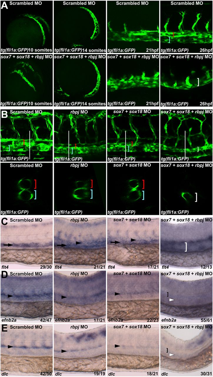 Triple sox7;sox18;rbpj knockdown results in the loss of a detectable dorsal aorta. (A) Analysis of GFP expression in tg(fli1a:GFP) zebrafish embryos after injection of control (Upper) and triple sox7;sox18;rbpj MO (Lower) during the migration of angioblasts from the lateral plate mesoderm toward the midline and coalescence into a vascular cord. At 26 hpf, the dorsal aorta (red bracket) and posterior cardinal vein (blue bracket) can be detected in the control MO-injected embryo but not in the triple MO (white bracket highlights single axial vessel). See also Fig. S7 A and B. (B) Lateral view (Upper) and optical transversal sections (Lower, location indicated by white bar) of control, rbpj, sox7;sox18, and sox7;sox18;rbpj MO-injected fli1a:EGFP embryos at 2 dpf. See also Movies S1, S2, S3, and S4 for 3D animations of each embryo. (C–E) Whole-mount in situ hybridization of venous (C) and arterial (D and E) markers on control, rbpj, double sox7;sox1,8 and triple sox7;sox18;rbpj MO at 26 hpf. See also Fig. S8 A–D. Black arrowhead, dorsal aorta; white arrowhead, where dorsal aorta should be; black arrow, posterior cardinal vein; white bracket, single axial vessel; black bracket, notochord. Probes used are depicted in the bottom left of each picture. Values on the bottom right indicate number of embryos with the predominant and displayed phenotype per total number of embryos analyzed. In all cases, 0.125 pmol of sox7 and sox18 and 0.15 pmol of rbpj MO were used.