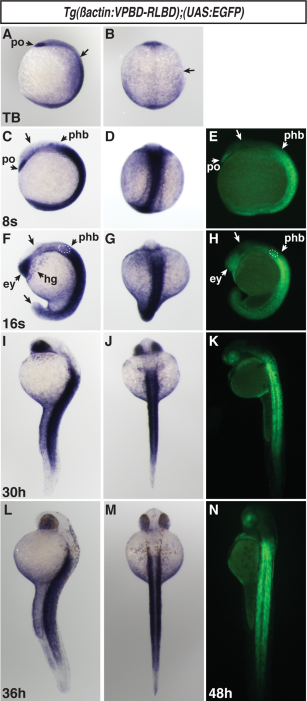 Expression in Tg(β-actin:VPBD-RLBD);(UAS:EGFP) embryos is consistent with the domains of RA-producing and -degrading enzymes. A, B: VP16-RA sensor expression at the TB stage. Arrowhead indicates strong expression in the polster (po). Arrows in A and B indicate the border between the posterior reporter expression and the anterior of the embryo, which lacks reporter expression. C–E: VP16-RA sensor expression via ISH and fluorescence at the 8s stage. Expression is maintained in the polster (po) and is largely absent in the anterior brain (arrows in C and E). There is strong expression throughout the posterior. Lower levels of expression extend into the posterior hindbrain (phb). F–H: VP16-RA sensor expression via ISH and fluorescence at the 16s stage. There is expression in the eyes (ey) and anterior brain, hatching gland (hg), and posterior hindbrain. Expression extends into the posterior hindbrain up to the otic vesicle (dashed outlines in F and H), which forms at the rhombomeres 5 and 6. Expression is absent in the brain and tip of the tail (arrows in F and H). I–K: RA reporter expression via ISH and fluorescence at 30 hpf. L, M: VP16-RA sensor expression via ISH at 36 hpf. N: VP16-RA sensor expression via fluorescence at 48 hpf. A, D, F, G, I, J, L, M, O are lateral views. B, E, H, K, N are dorsal views. In all images anterior is up.