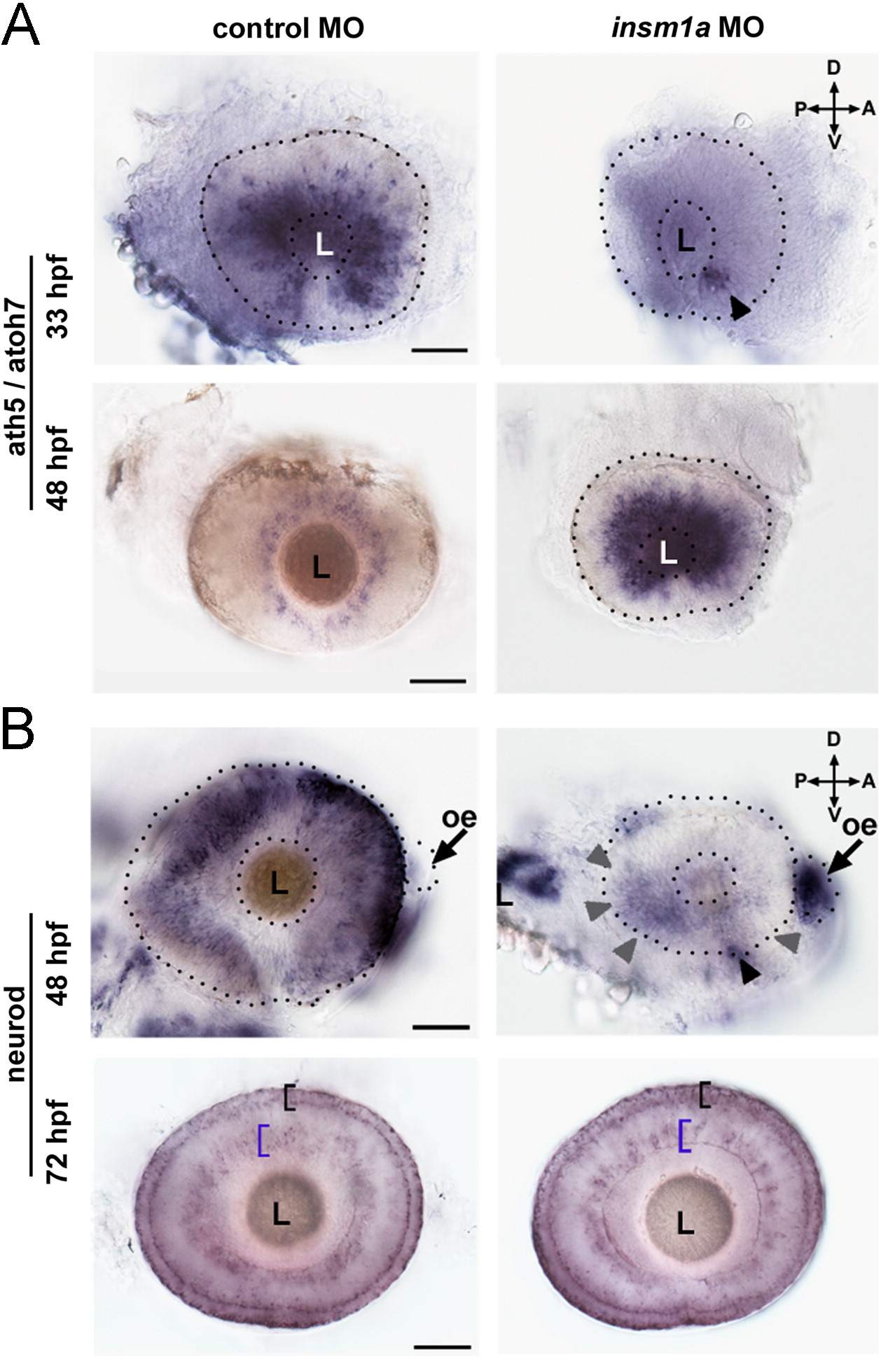 Insm1a acts upstream of pro-neural TFs ath5/atoh7 and neurod. (A) At 33 hpf ath5/atoh7 was expressed throughout the developing retina in controls; in contrast ath5/atoh7 expression was detectable only in the ventro-nasal patch of insm1a morphants (arrowhead). At 48 hpf, ath5/atoh7 expression in control retinas was restricted to the GCL; in insm1a morphant retinas, expression had expanded throughout the retina, in a pattern that closely resembled that of 33 hpf controls. (B) Neurod expression at 48 hpf was observed strongly in the developing photoreceptors and in the adjacent INL of control retinas. In insm1a morphants, however, neurod expression was mostly confined to the ventro-nasal retina (black arrowhead), with some expression throughout the central retina (gray arrowheads). In contrast, strong expression of neurod was observed in the olfactory epithelium (arrows) of insm1a morphants, which was absent in controls. By 72 hpf, neurod expression in the ONL (black bracket) and inner portion of the INL (blue bracket) was qualitatively similar in both controls and insm1a morphants. Scale bars=50 μm; D, dorsal; V, ventral; A, anterior; P, posterior; GCL, ganglion cell layer; oe, olfactory epithelium; ONL, outer nuclear layer INL, inner nuclear layer; hpf, hours post fertilization.