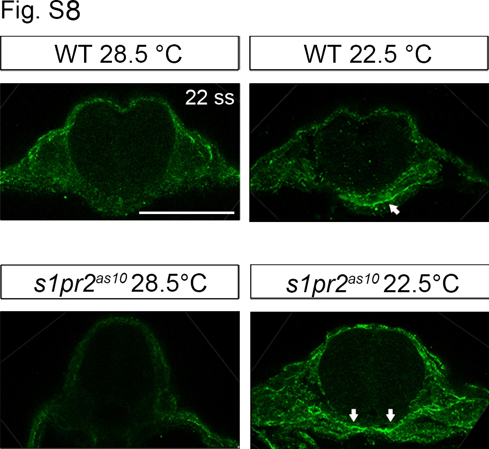 Low temperature increases fibronectin 1 expression in the midline region. Immunohistochemistry was used to demonstrate increased fibronectin 1 expression at the midline region (white arrows) of 22-ss wild type (WT) and s1pr2as10 mutant embryos raised at 22.5°C. Scale bars = 100 μm.
