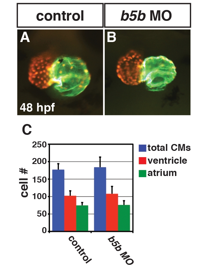 A suboptimal dose of hoxb5b MO does not affect CM cell number at 48hpf. (A, B) Hearts from control sibling and Hoxb5b deficient Tg(-5.1myl7:DsRed-NLS)f2 embryos at 48hpf. Images are frontal views. Red indicates ventricle. Green indicates atrium. (C) Mean CM number at 48hpf.