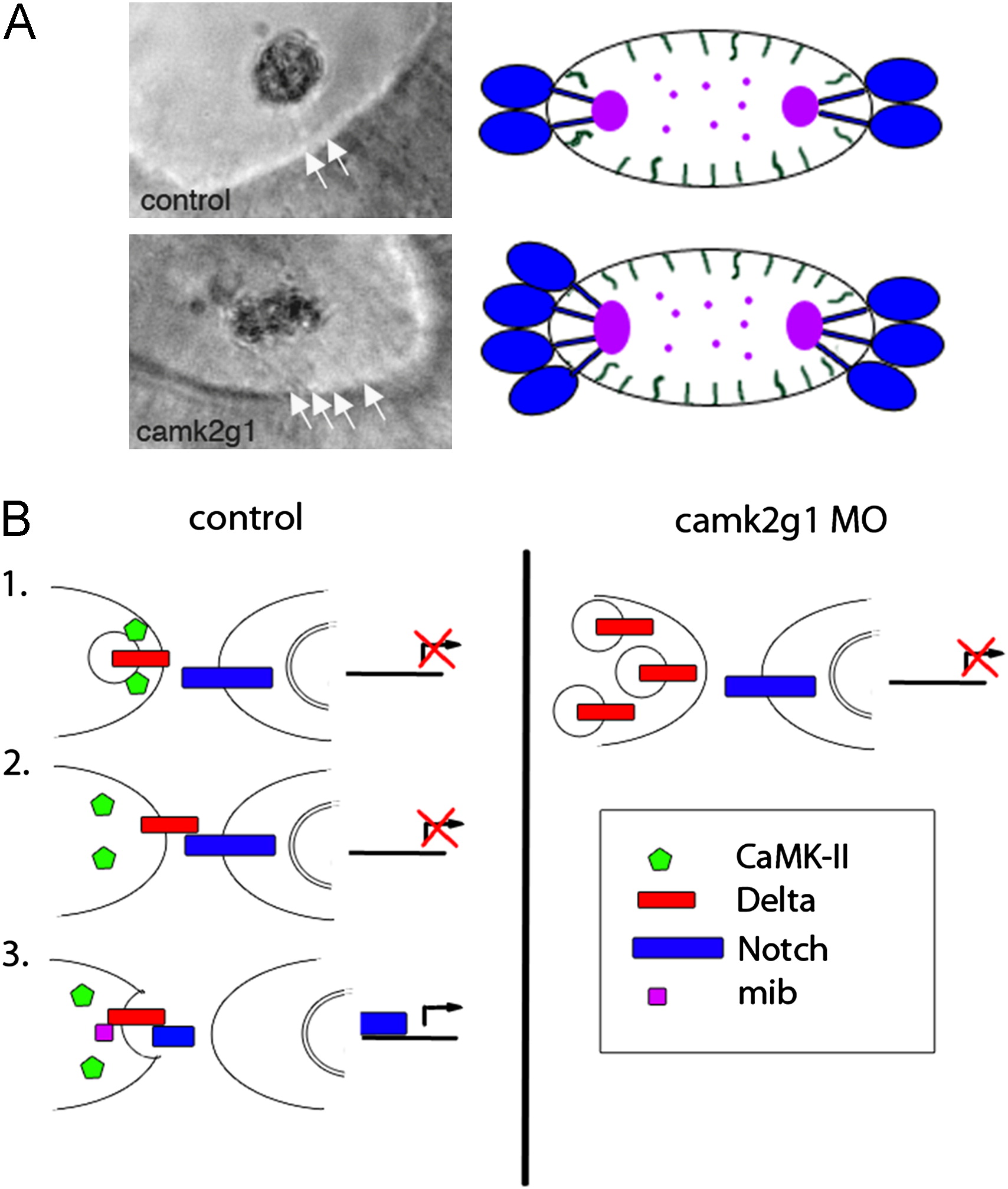 Fig. 7 Model of action. (A) Screen shots from control and camk2g1 morphant embryos at 24 hpf. Control embryos have two immotile kinocilia (white arrows) bound to the seeding otolith. Camkg1 morphants have extra hair cells as demonstrated by extra kinocilia (B, white arrows). (B) The additional hair cells are formed as a result of improper Delta–Notch signaling. (1) In control embryos CaMK-II aids in secretory vesicle trafficking and fusion to the plasma membrane. (2) Once Delta is deposited at the membrane it can bind to the Notch receptor. (3) Transendocytosis occurs due to mib (mindbomb; E3 ubiquitin ligase) activity, causing the NICD to be cleaved and enter into the nucleus influencing transcription. In the absence of CaMK-II, Delta ligands are not deposited at the membrane and accumulate in secretory vesicles in the cytosol, therefore inhibiting transcription in the Notch expressing cell.