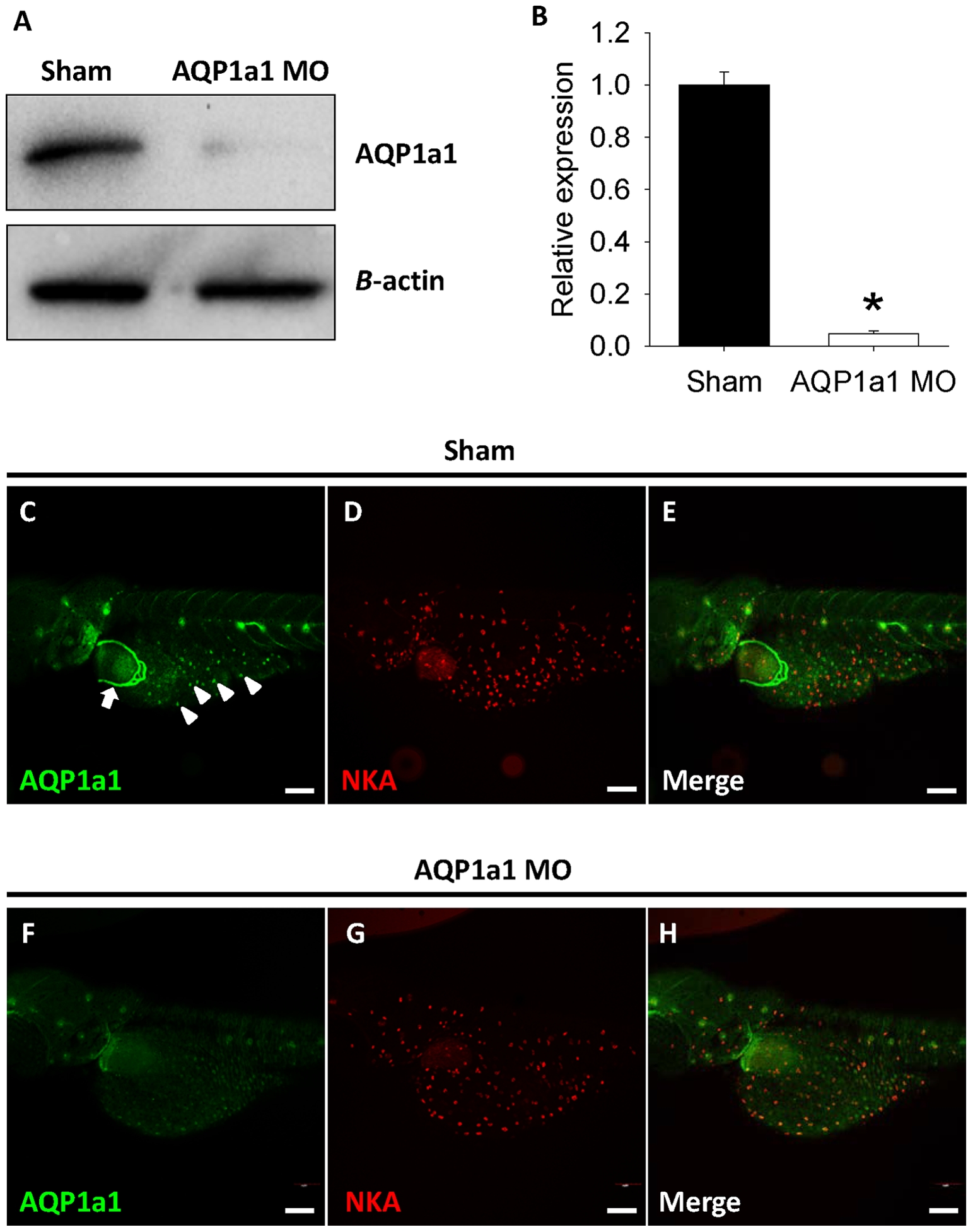 (A) A representative western blot showing the protein expression of aquaporin-1a1 (AQP1a1) in lysates of 4 dpf shams and AQP1a1 morphants (AQP1a1 MO) is reduced following morpholino knockdown. (B) Subsequent quantitative analysis revealed that the protein expression level of AQP1a1 in the morphants was significantly than shams (Student′s t-test; p<0.05). Values are means ± SEM (n = 4). Fluorescent immunohistochemistry and confocal microscopy revealed the expression of (C) AQP1a1 (green; arrowhead) and (D) Na+/K+-ATPase (NKA; red) on the skin of yolk sac in the shams. AQP1a1 was also expressed in the red blood cells (Figure C; arrow). Figure (E) is a merged image of (C) and (D). (F) The expression of AQP1a1 was virtually absent in the morphants following the AQP1a1 knockdown. Figure (G) shows the expression of NKA, and Figure (H) is a merged images of (F) and (G). Scale bar = 50 μm.